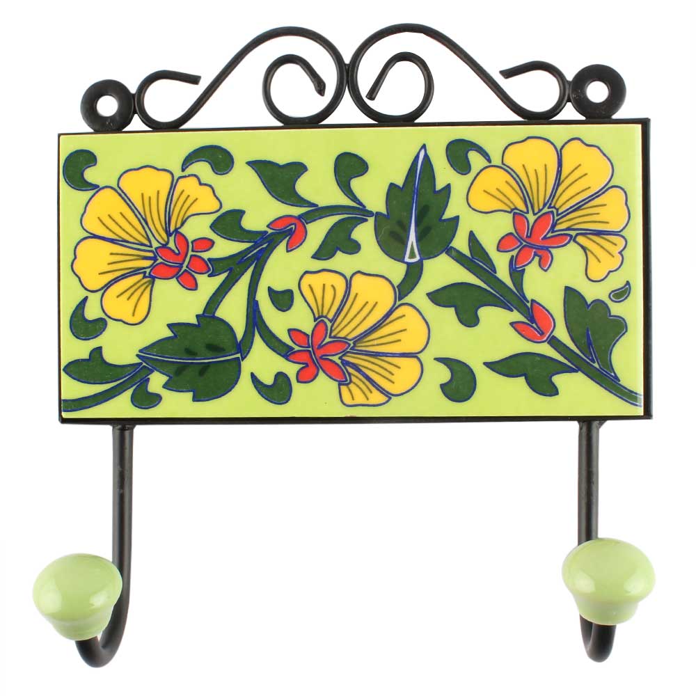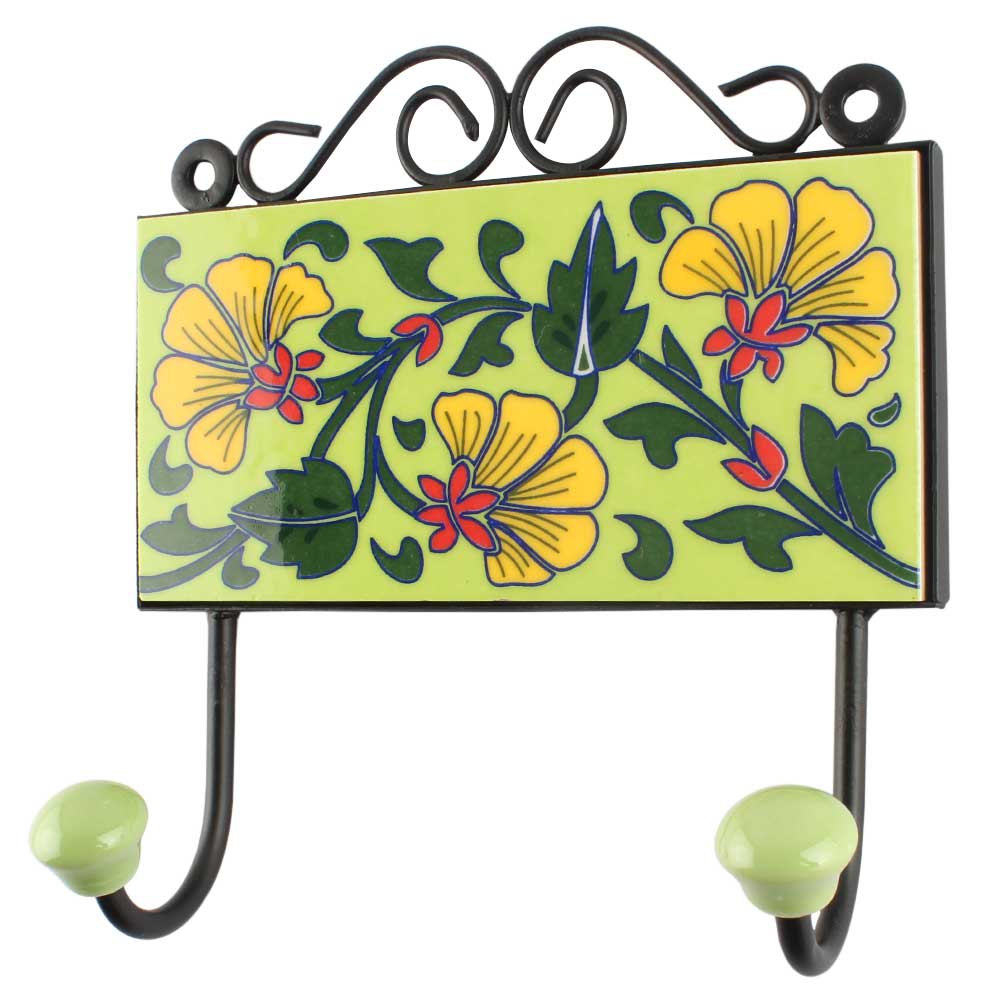 Pea Green Leaf Flower Ceramic Tile Hook. When Put on Wall or Cabinet It is An Art in Itself. The Metal Part of this Hook is Black Powder Coated.