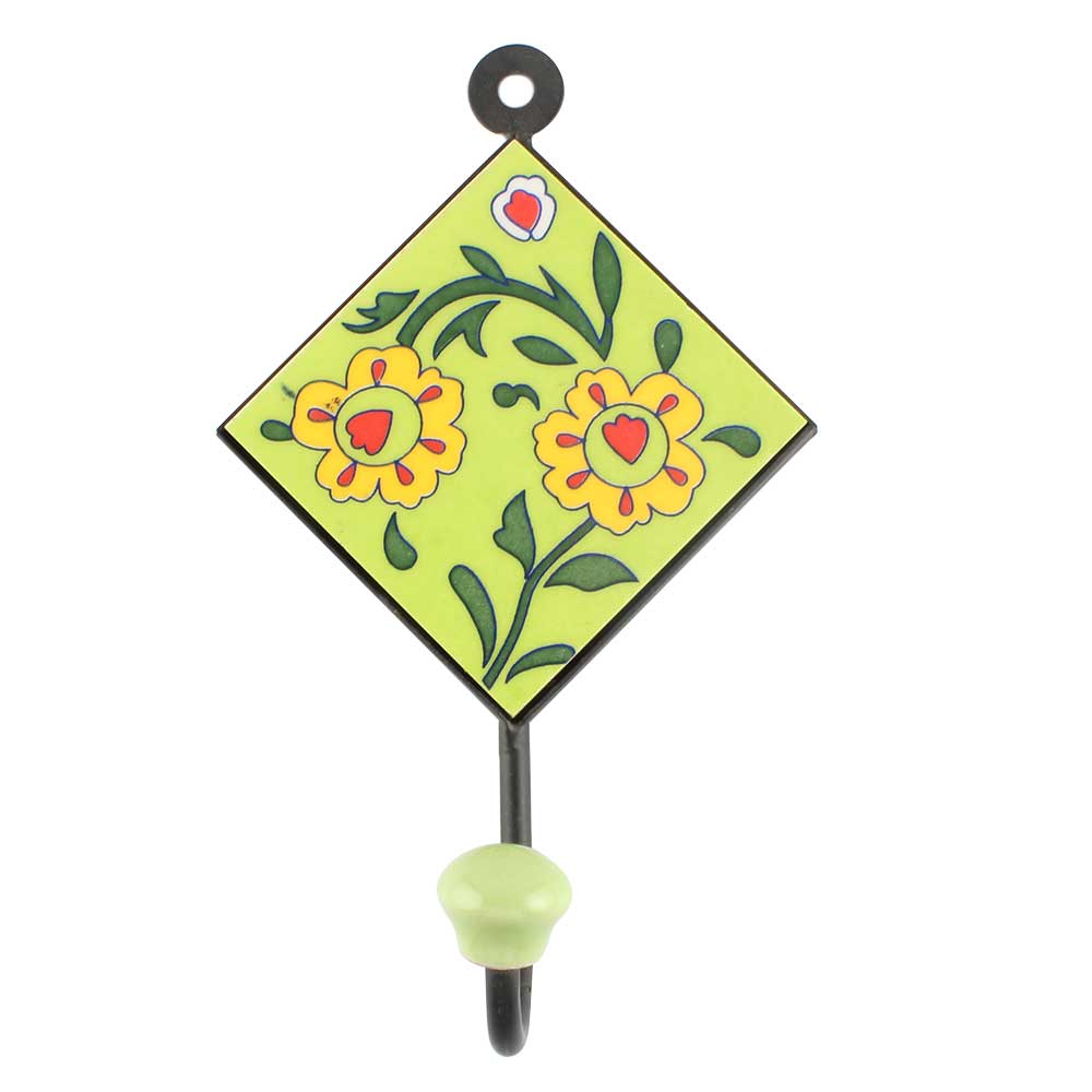 Pea Green Leaf Flower Ceramic Tile Hook. When Put on Wall or Cabinet It is An Art in Itself. The Metal Part of this Hook is Black Powder Coated.