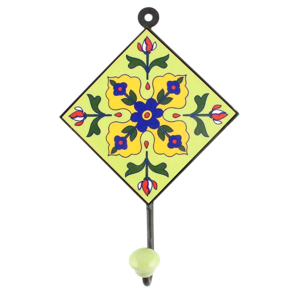 Pea Green Leaf Flower Ceramic Tile Wall Hook. When Put on Wall or Cabinet It is An Art in Itself. The Metal Part of this Hook is Black Powder Coated.