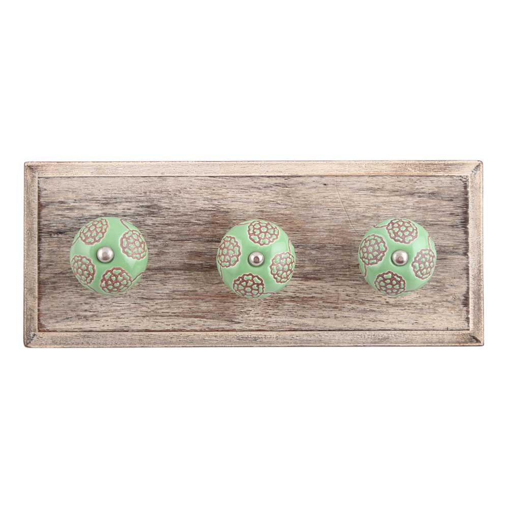 Pea Green Marigold Etched Ceramic Wooden Hook. A Perfect Complement to the Soft Tone of the Wood are these White Traditional Hat Coat Hook Made of Genuine Porcelain and Brass. It can be use to Hang Jewellery, Leashes, Towels, Scarves, Light Weight Sweaters, Caps Etc.