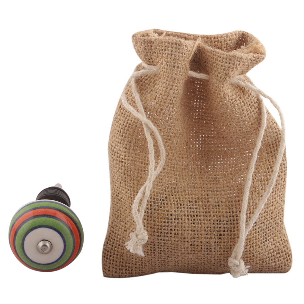 Pea Green Striped Ceramic Wine Stopper. Zinc Alloy Wine Bottle Stopper with Attractive Jute Bag Packaging.