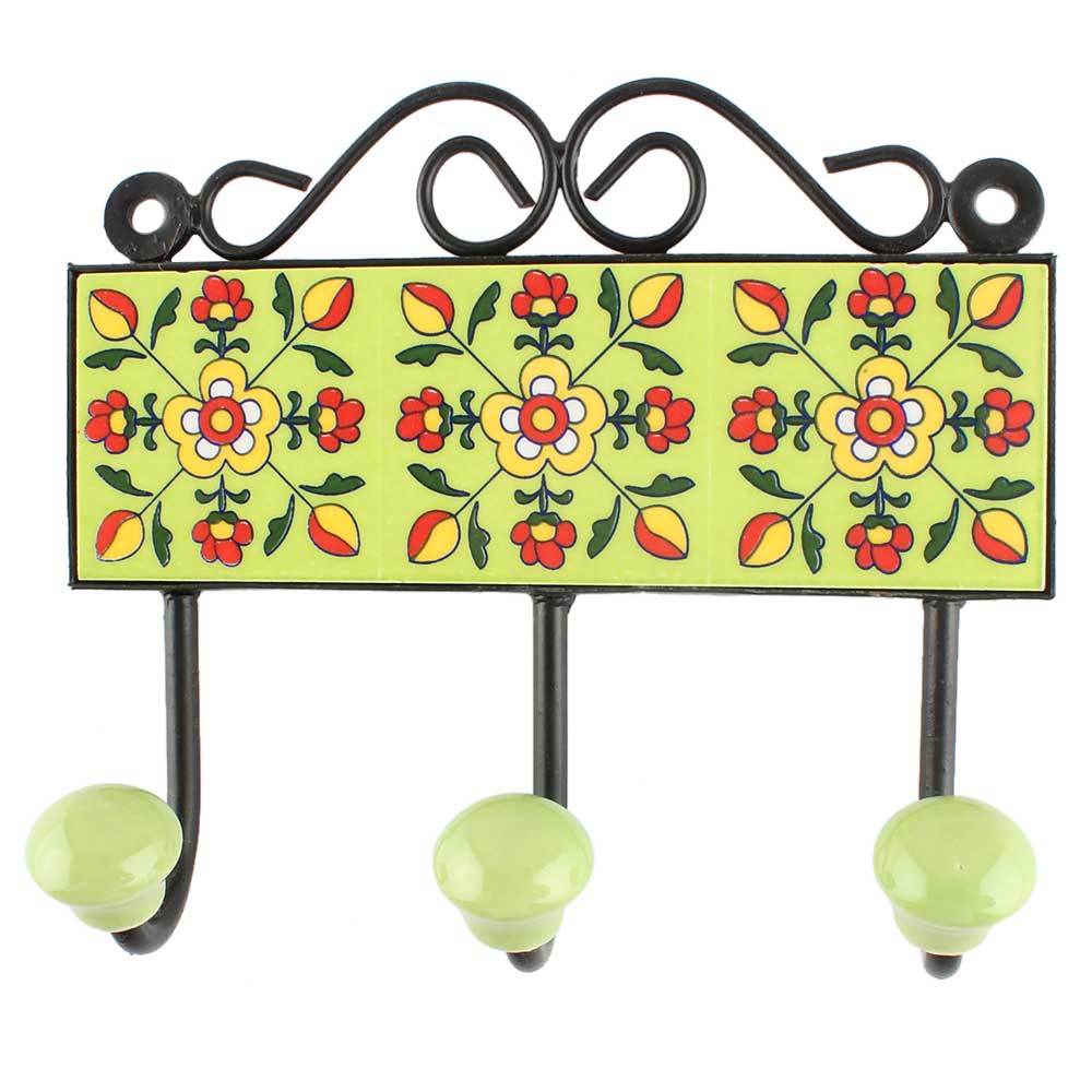Pea Green Tiny Flower Ceramic Tile Hook. When Put on Wall or Cabinet It is An Art in Itself. The Metal Part of this Hook is Black Powder Coated.