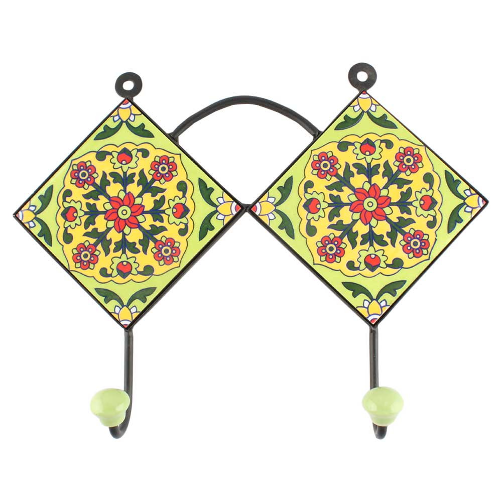 Pea Green Tiny Flower Ceramic Tile Wall Hook. When Put on Wall or Cabinet It is An Art in Itself. The Metal Part of this Hook is Black Powder Coated.