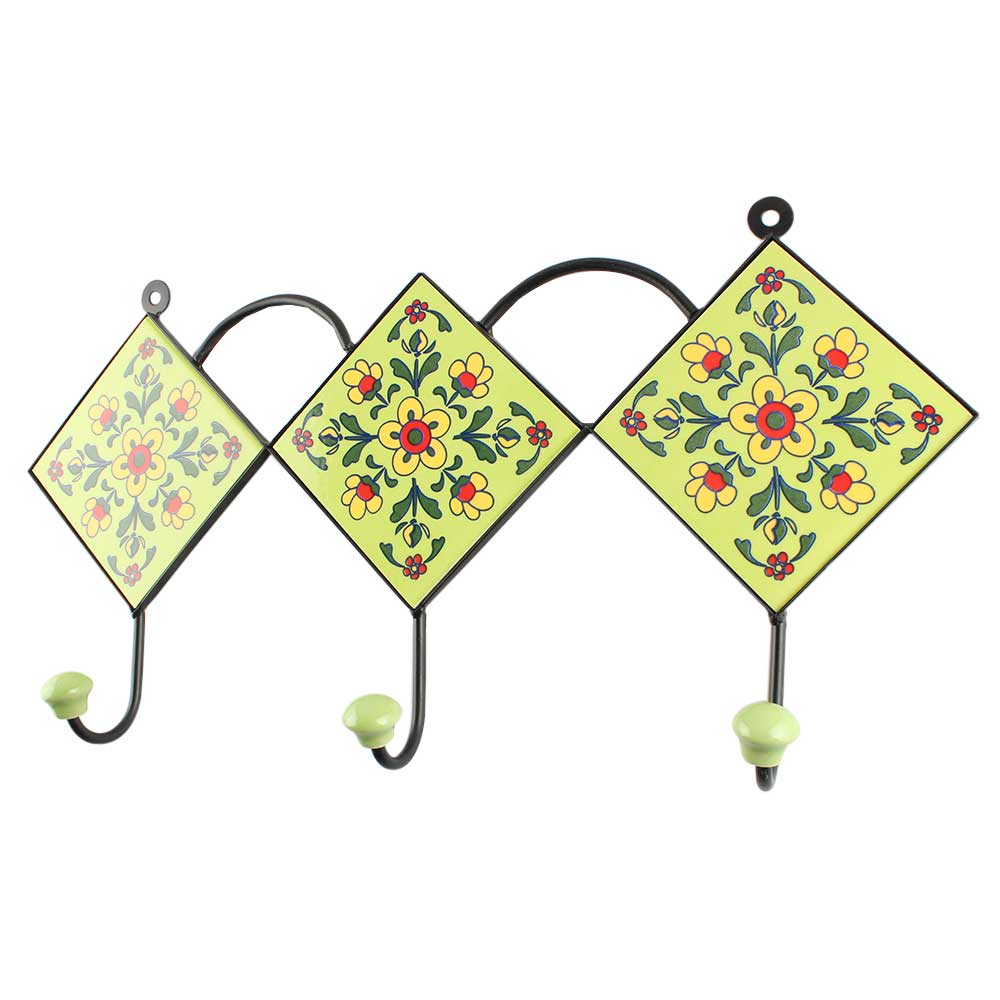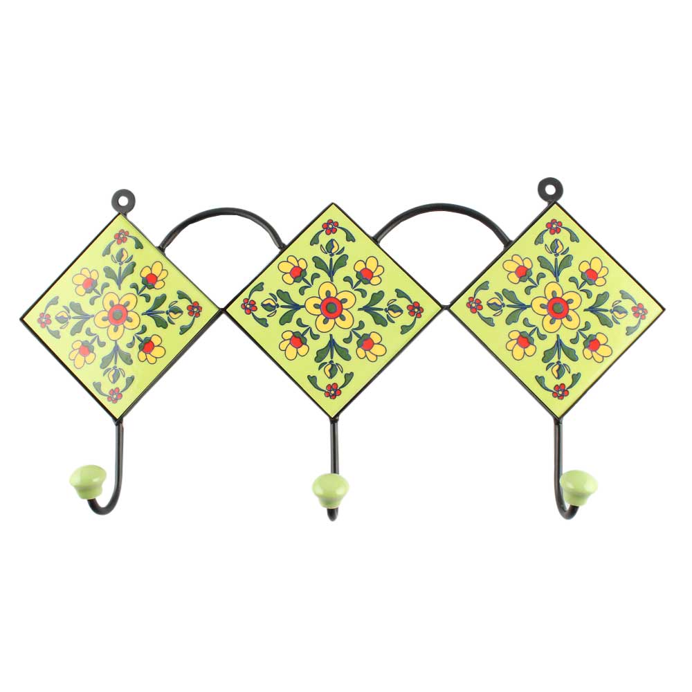 Pea Green Tiny Flower Ceramic Tile wall Hook. When Put on Wall or Cabinet It is An Art in Itself. The Metal Part of this Hook is Black Powder Coated.