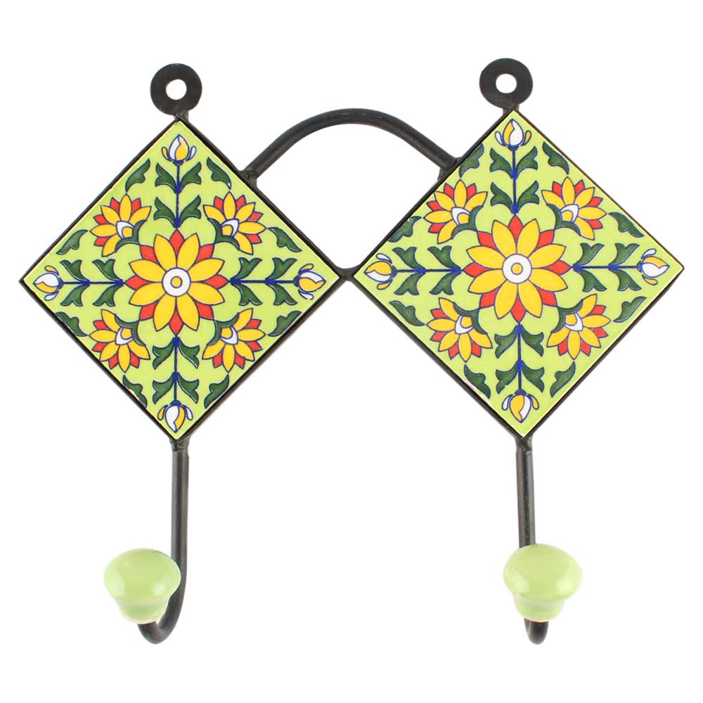 Pea Green Wheel Flower Ceramic Tile Hook. When Put on Wall or Cabinet It is An Art in Itself. The Metal Part of this Hook is Black Powder Coated.