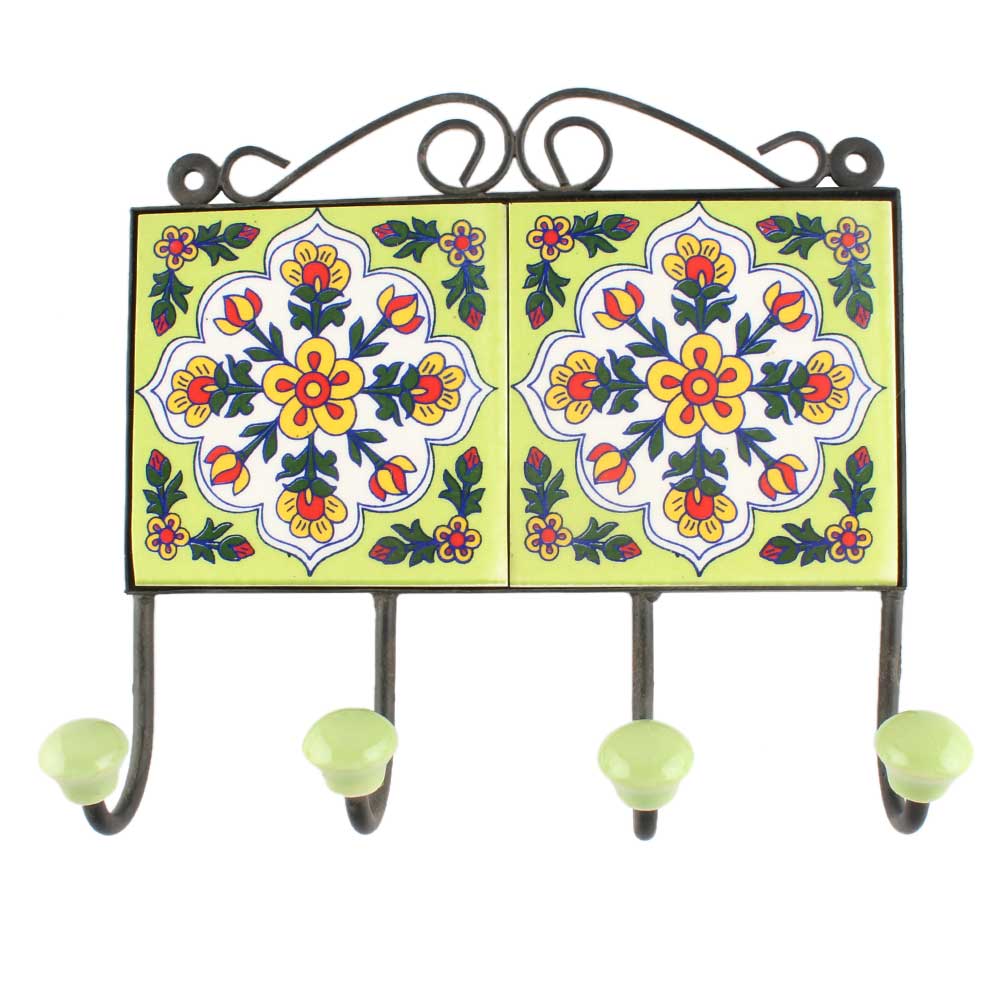 Pea Green With White Floral Ceramic Tile Hook Online. When Put on Wall or Cabinet It is An Art in Itself. The Metal Part of this Hook is Black Powder Coated.