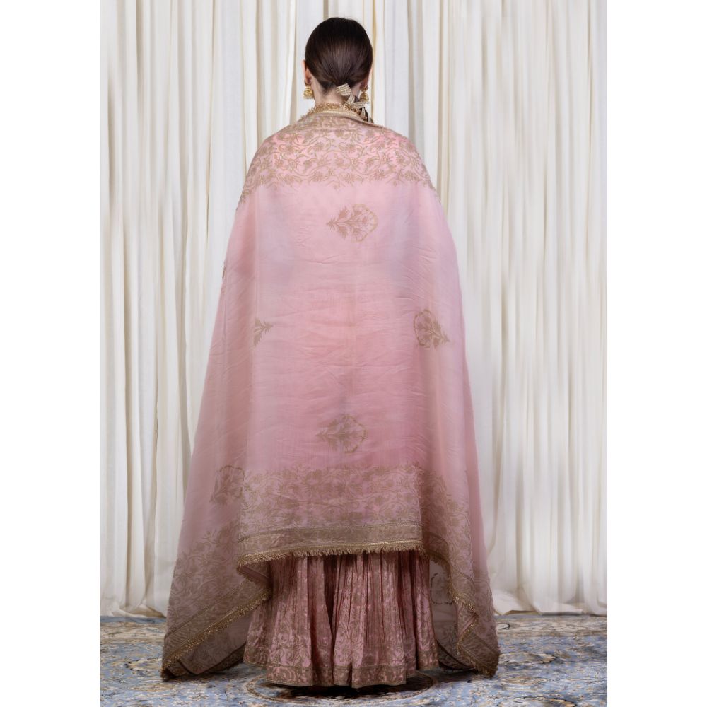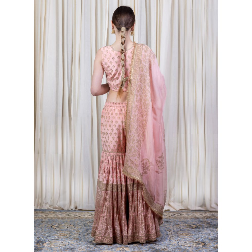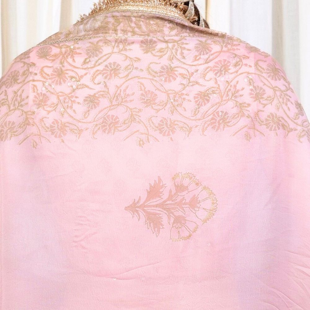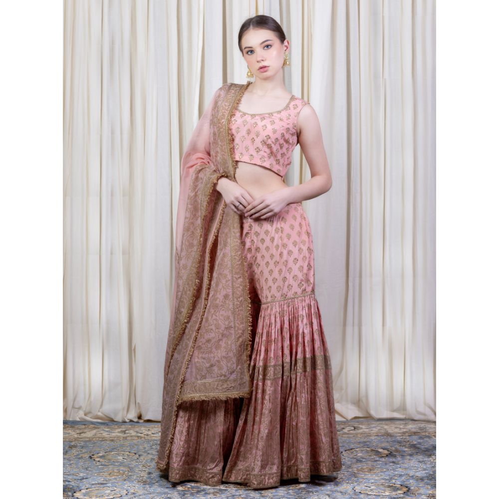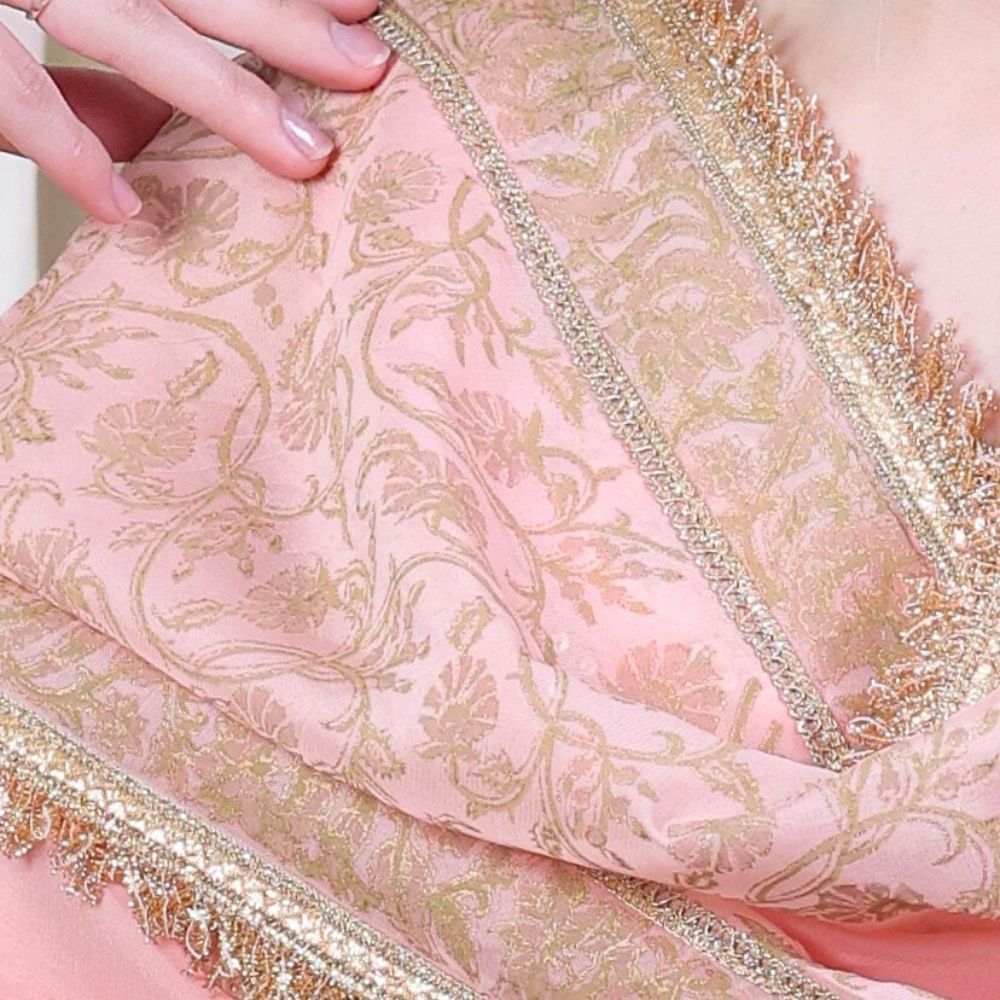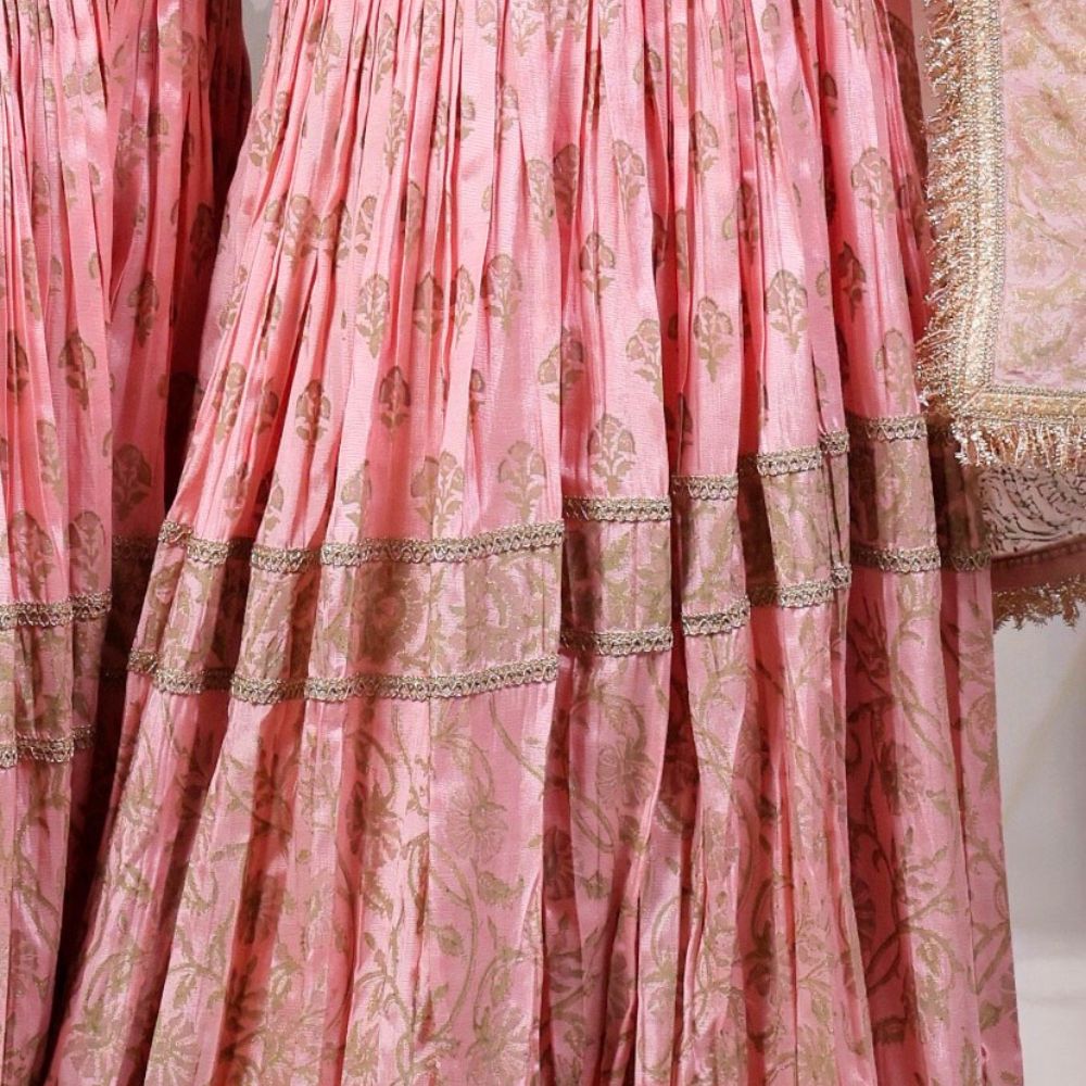 Turn heads with this stunning Peach Blouse and Sharara Set, a perfect fusion of contemporary style and traditional craftsmanship. Made from soft muslin fabric, the sleeveless blouse features elegant hand block prints and delicate hand embroidery that elevate its festive charm. The high-waisted tiered sharara, also in muslin, offers a voluminous and graceful silhouette, making it ideal for weddings, sangeet nights, or festive celebrations. The rich peach tone complements all skin tones, while the golden motifs add a subtle sparkle. Completing the ensemble is a sheer viscose organza dupatta with embroidered borders that adds an ethereal finishing touch. This handcrafted outfit brings together comfort, luxury, and heritage with a modern twist — perfect for the confident woman who wants to make a statement. Pair it with statement earrings and heels for an effortlessly glamorous ethnic look that blends tradition with trend.