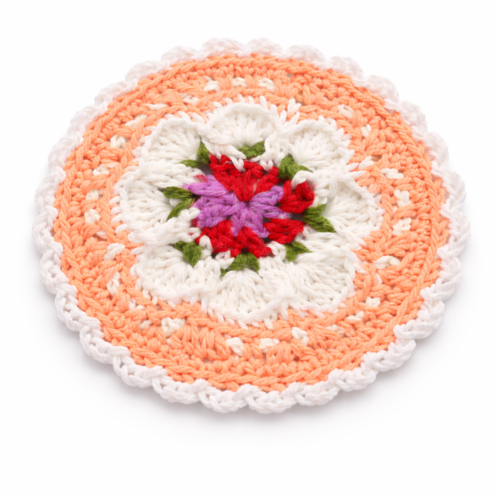 • Peach Floral Crochet Doily Handcrafted Cotton Yarn