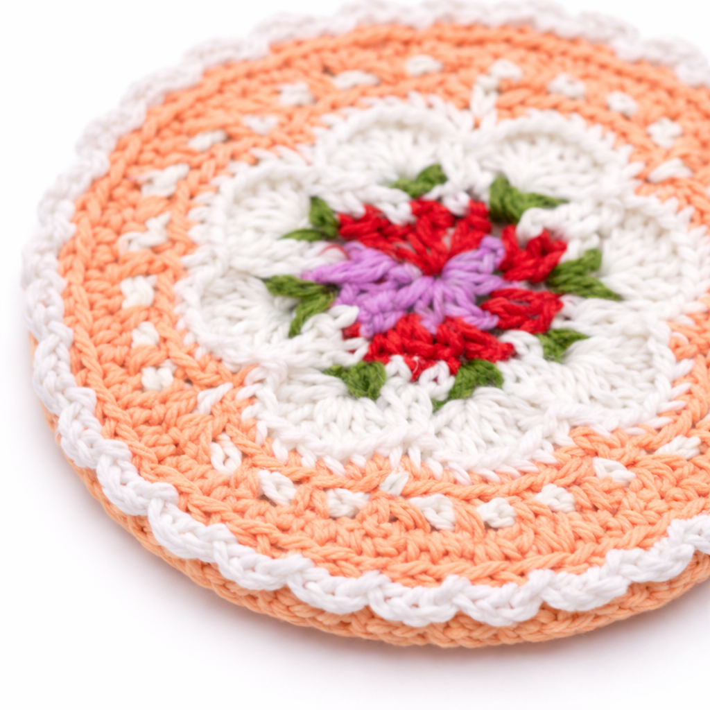 This peach crochet doily coaster is handcrafted using soft cotton yarn and features a delicate floral design at the center. The warm peach crochet pattern combined with a white lace border creates an elegant handmade table accessory. Designed for both decoration and functionality, this cotton yarn doily coaster protects surfaces from heat, stains, and moisture while enhancing everyday table settings.