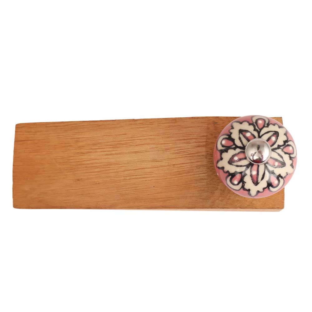Peach Flower Ceramic Wooden Door Stopper.Wooden Door Stopper with a Ceramic Knob to Carry it Easily. This Wooden Door Stopper has Glue Dots under it to Ensure that it does not Slip. It is Handmade by the Craftsmen of India and this Innovative Door Stopper won't Disappoint You.