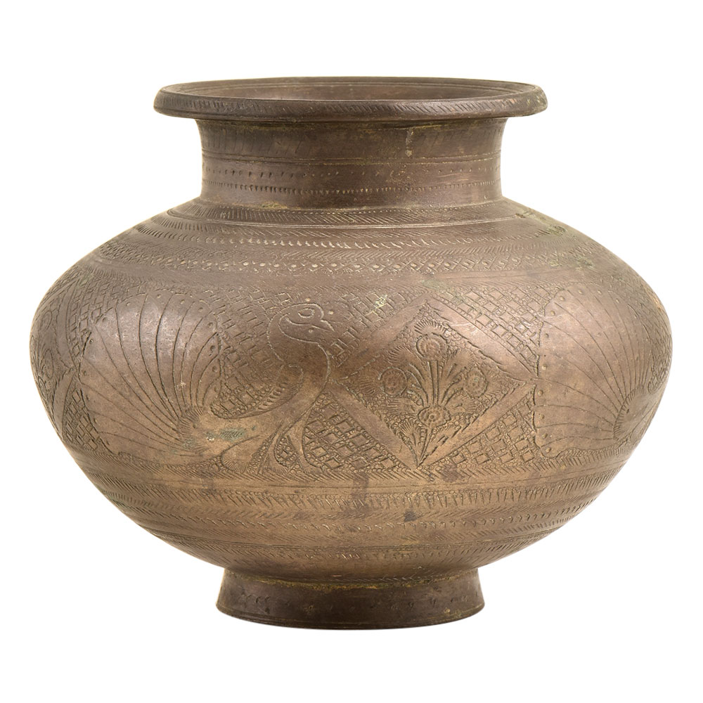 A very elegant water pot with peacock engraved on the surface of the pot. It has other designer aspects also carved on it like flowers, diamonds and patterns to complete the look. It is used to store holy water and kept in the temple or other places of worship. Made by expert artisans who are masters of their craft and each piece is made separately so that there is no duplication of the product.