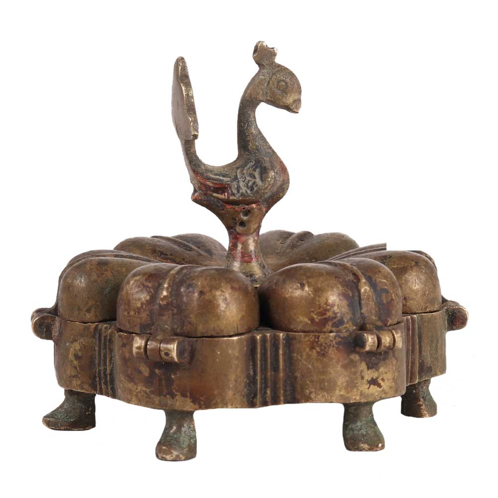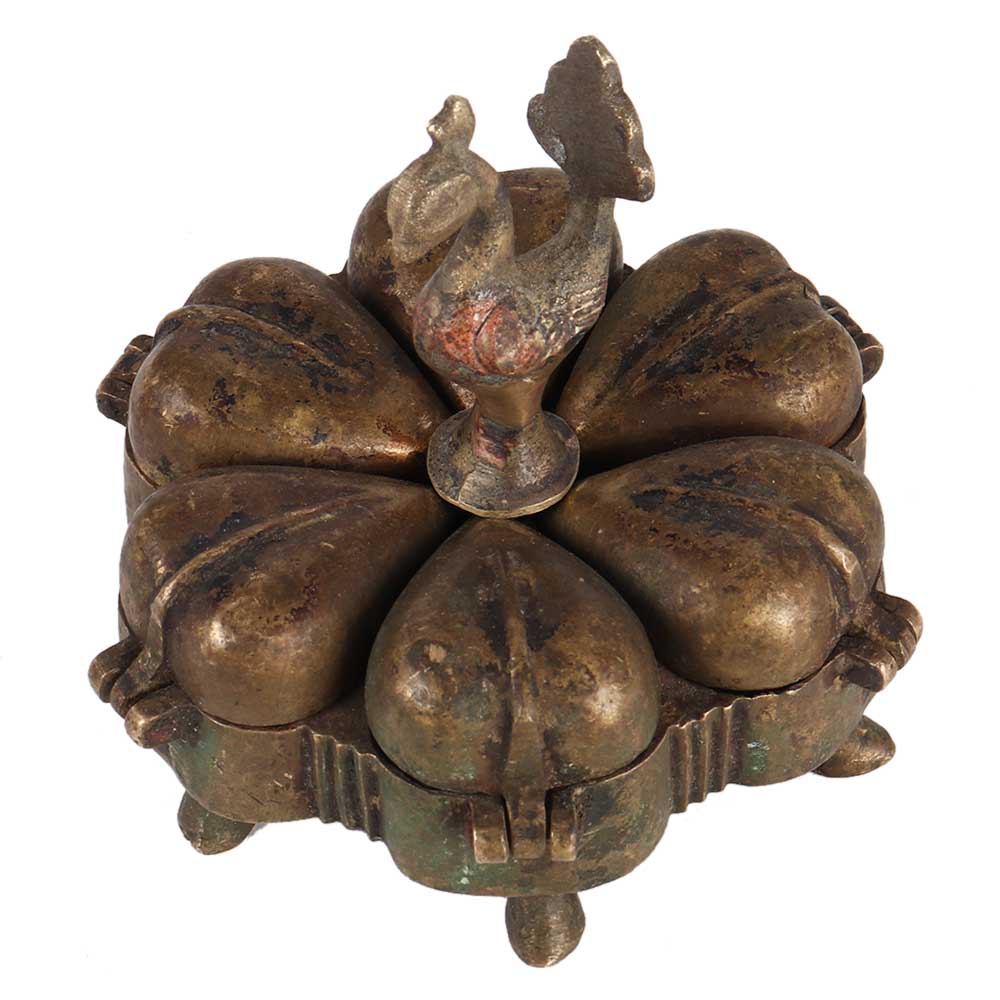 The artisans of india created this exquisite box out of brass. It has 6 compartments and a bird on top. Loosen the bird on top to access each chamber. It is crafted with great accuracy. It used to  was used to keep ayurvedic powders, beauty products, seasonings, vermilion, as well as other powders protected. It can also serve as a luxury item.