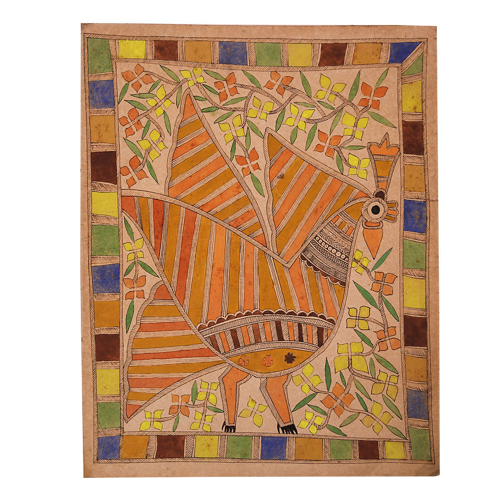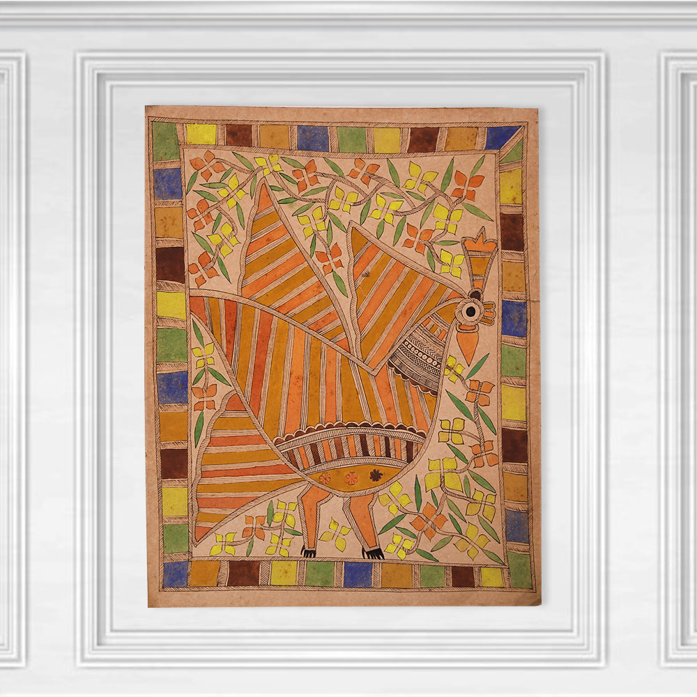 Immerse yourself in the captivating world of traditional Madhubani art with this stunning paper painting of a peacock. Crafted by a skilled artist, this vibrant masterpiece showcases the rich cultural heritage of India through its intricate patterns and bold color palette. Bring the essence of India into your home with this captivating Madhubani peacock painting. More than just a work of art, this piece is a testament to the enduring artistic traditions of the Mithila region. Display it proudly, and let its vivid hues and mesmerizing patterns transport you to a world of beauty and cultural richness. Whether you're an art enthusiast, a lover of Indian heritage, or simply seeking to add a stunning focal point to your decor, this Madhubani peacock painting is a must-have. Elevate your space and immerse yourself in the vibrant, soulful expression of this timeless art form.