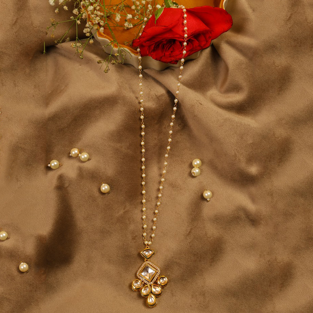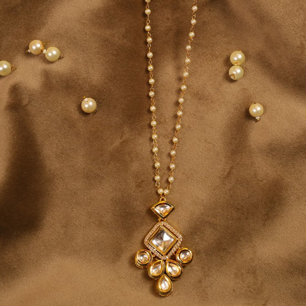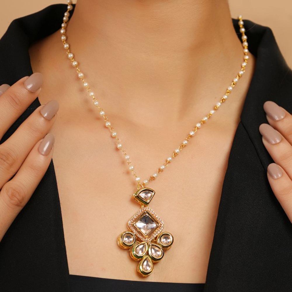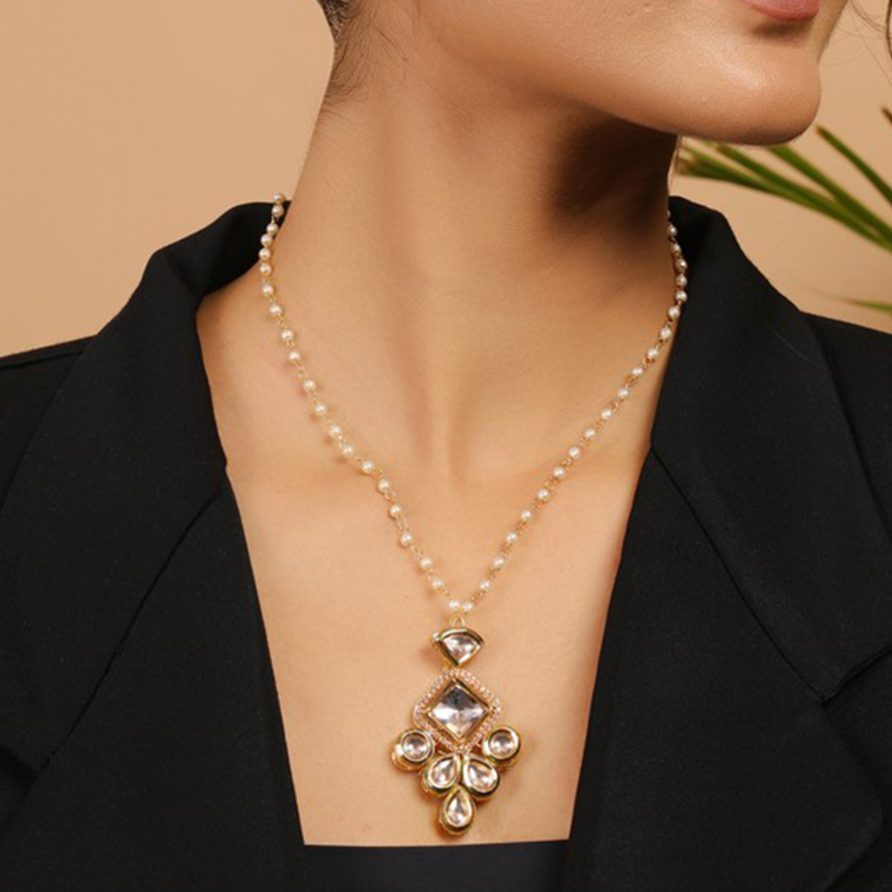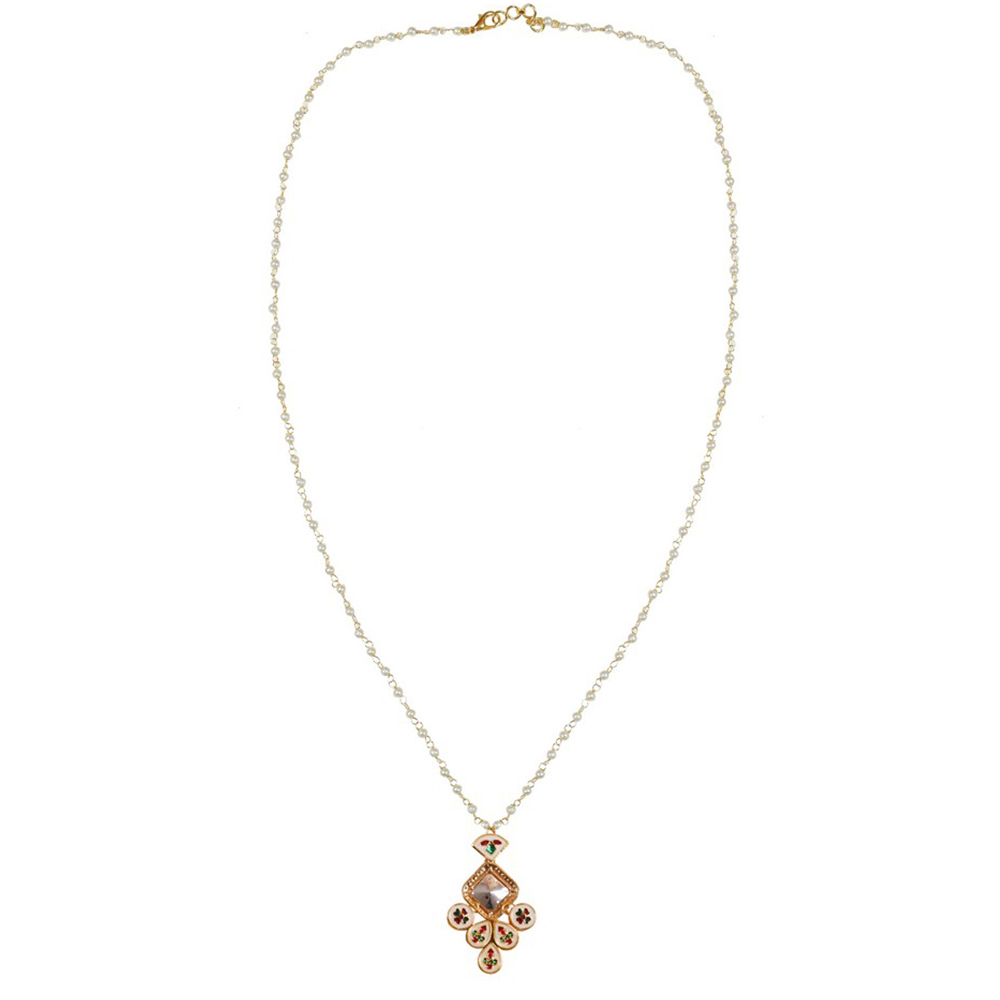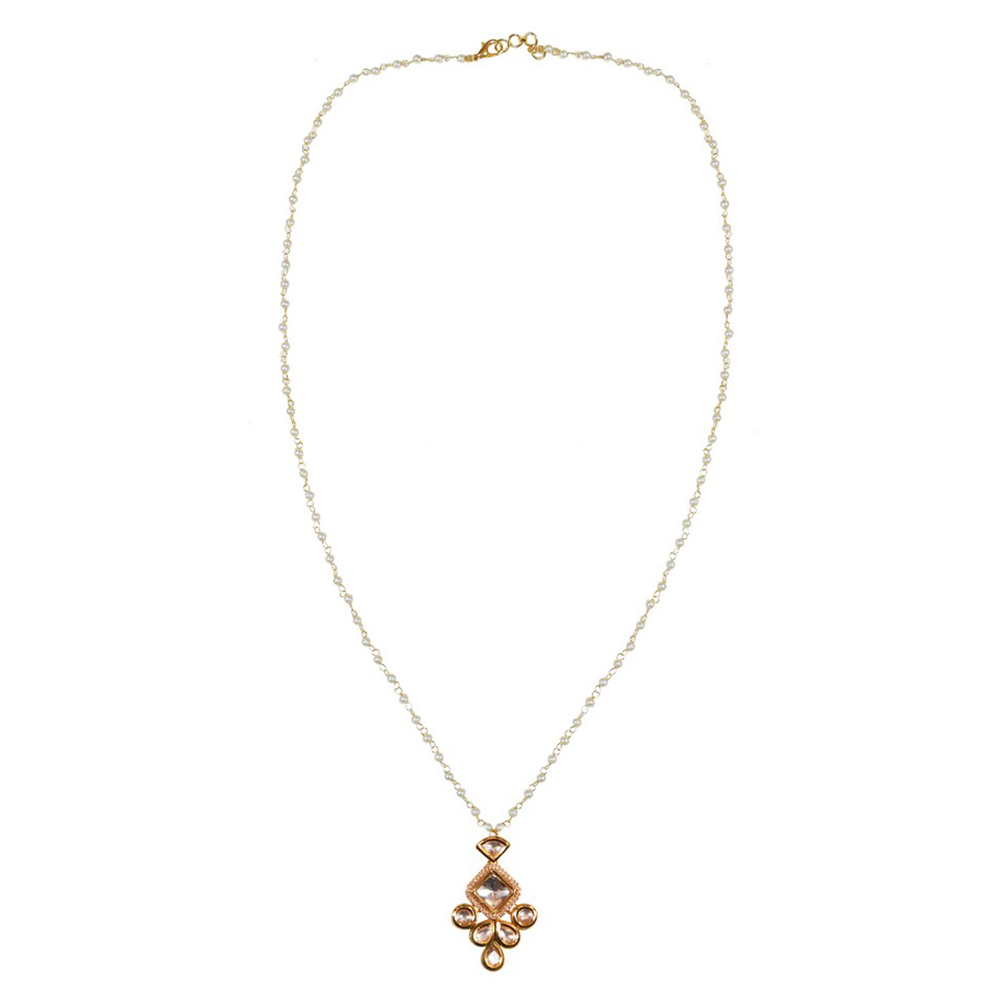 • Pearl Chain Necklace with Geometric Kundan Drop Pendant