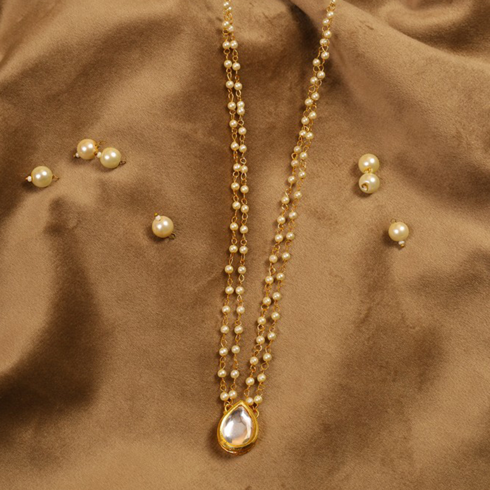 Celebrate individuality with this Pearl Double Strand Necklace with Clear Teardrop Pendant. Featuring two layers of pearls joined by a striking clear teardrop pendant encased in a gold-tone bezel, this elegant necklace is perfect for weddings, parties, and meaningful gifting. Packed & quality-checked by Indianshelf.