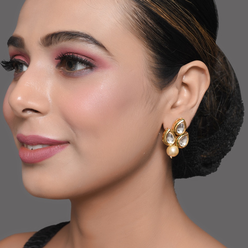 The Pearl Drop Mirror Stud Earrings with Triple Teardrop Design are crafted to bring graceful sparkle to festive and everyday ethnic styling. Designed in polished golden brass, these earrings feature a radiant mirror stud complemented by three cascading teardrop elements. Each drop is accented with soft pearl detailing, creating gentle movement and refined elegance. With their compact 1.5 inch silhouette, this handcrafted pair offers timeless charm without overwhelming the look.