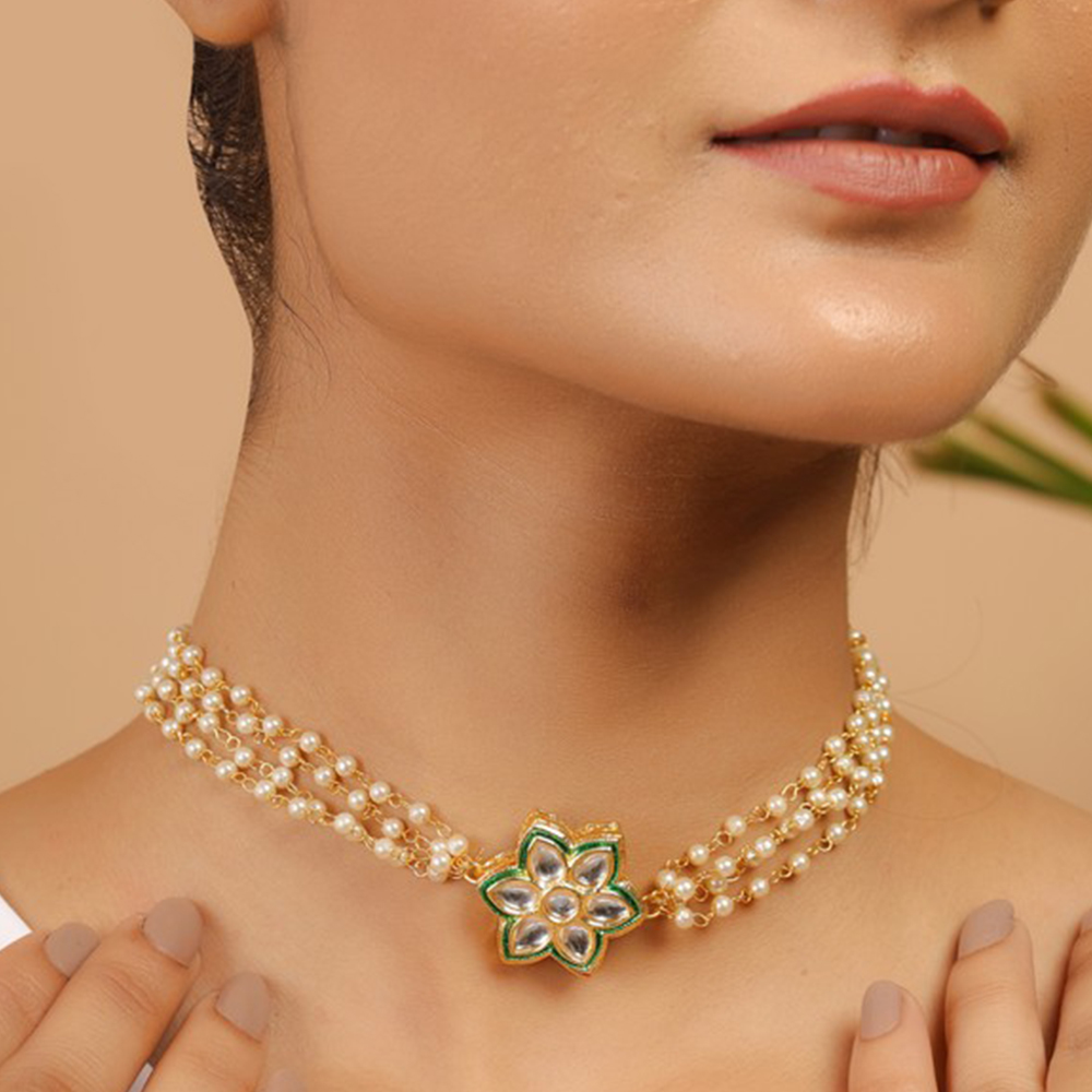 The Pearl Kundan Flower Choker Necklace with Gold Tone is a refined celebration of traditional Indian jewelry design. Crafted in brass with a luminous golden finish, this 14-inch choker sits gracefully along the neckline. Intricately arranged pearl accents form a delicate base, while the floral kundan centerpiece brings timeless heritage charm. The combination of soft white pearls and warm gold tones creates a look that feels both regal and effortlessly elegant.