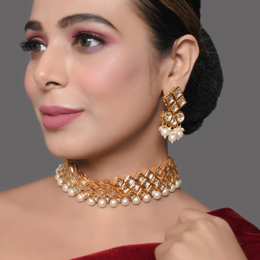 Elegant and structured, this mirror stone choker necklace set features a refined lattice-style arrangement that sits gracefully along the neckline. The design is finished with a soft row of pearl drops that add movement and a classic bridal touch. Paired with coordinating drop earrings, this set offers a balanced blend of tradition and contemporary styling.