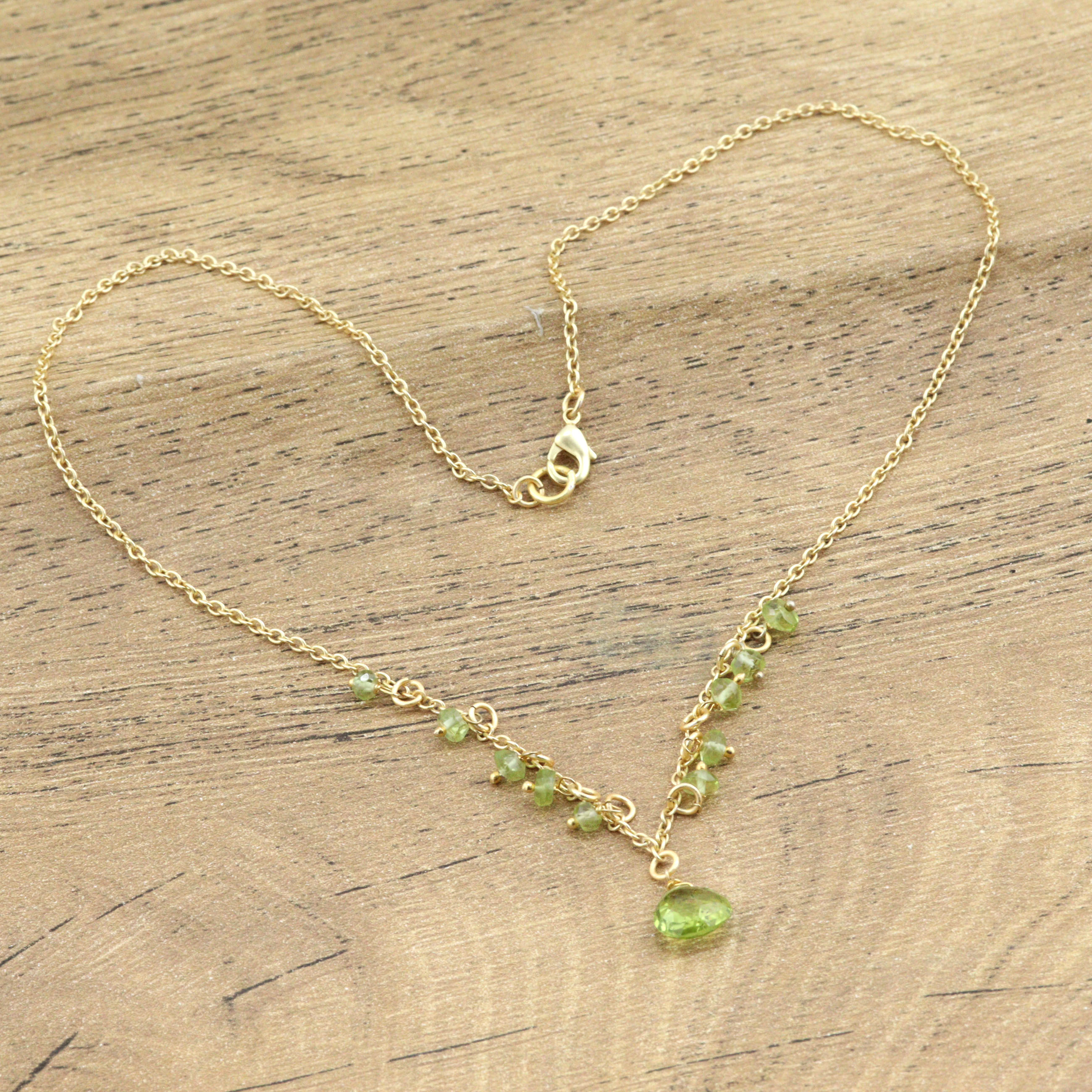 Keep your peridot necklace away from moisture and clean gently with a soft cloth to preserve its glow and gold finish.