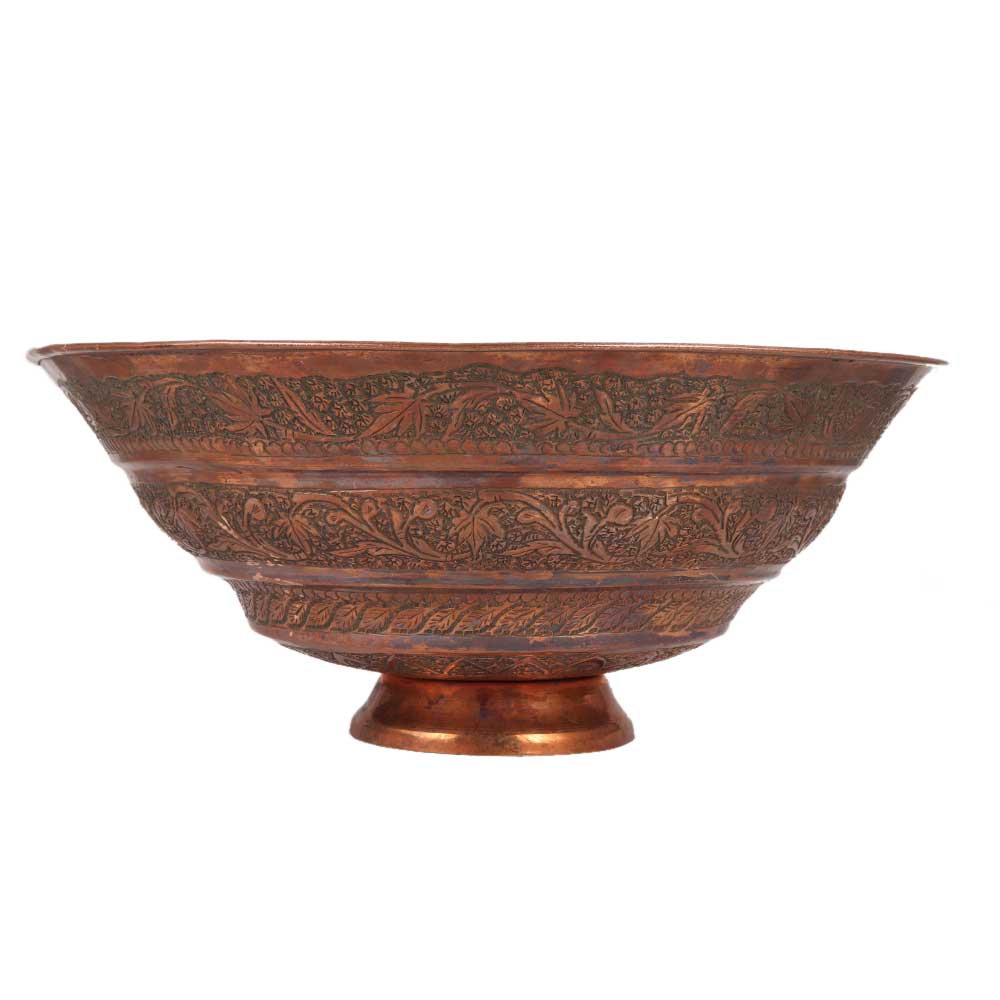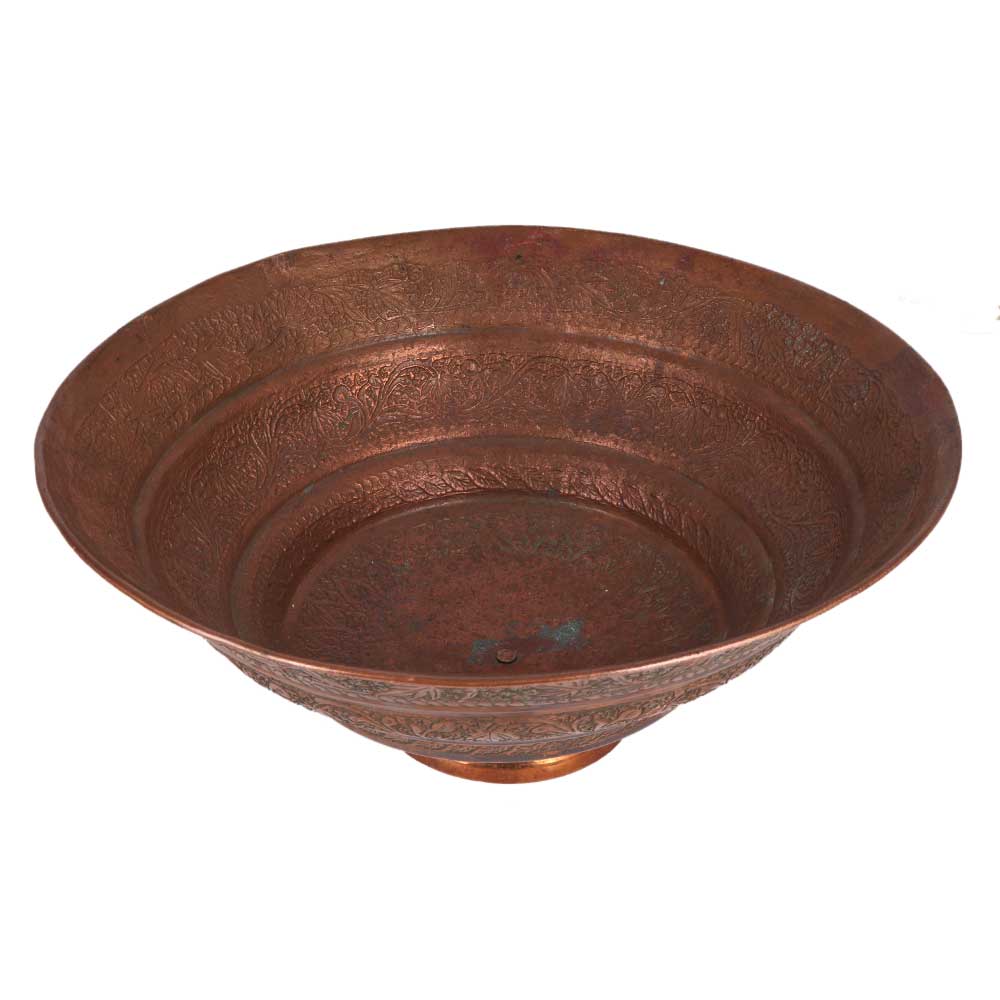 The striking elegance of the bowl's design, in contrast to the widespread beautiful leaves, flowers, and tendrils on this copper bowl, suggests that it was made in Persian workshops. A master craftsman created this bowl. It's made of thick copper. The inside is simple.