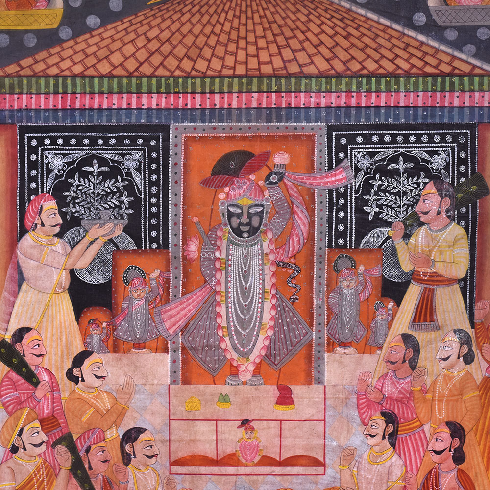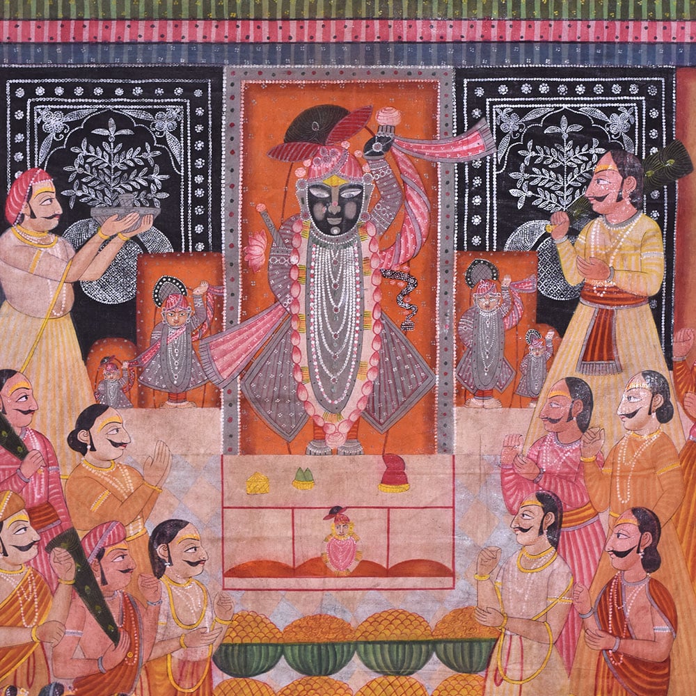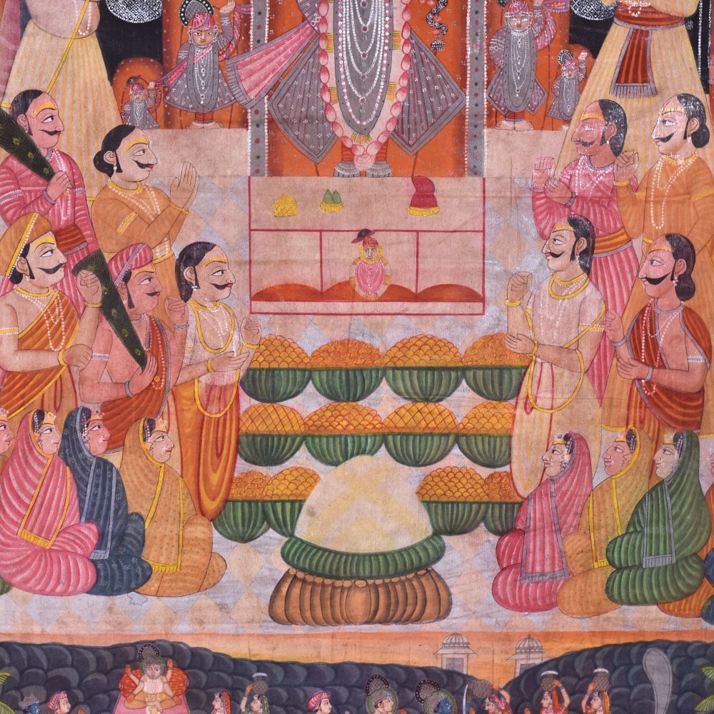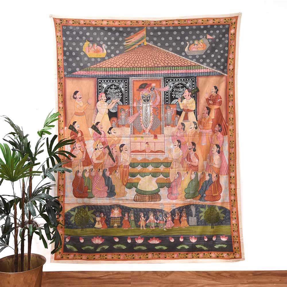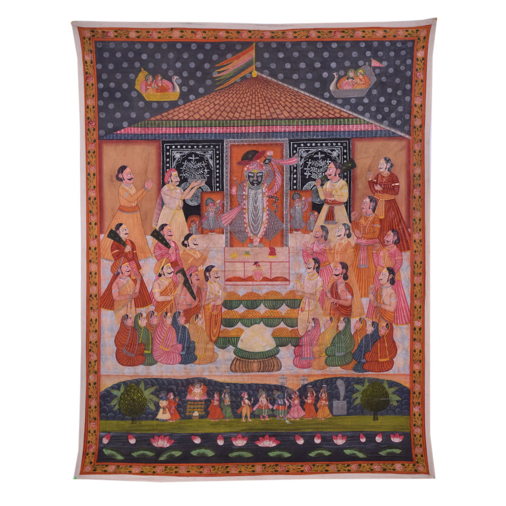 Pichwai art Annakut Srinathji painting is a traditional type of Indian art that represents Lord Krishna in the avatar of Srinathji. The painting is usually done on a massive piece of fabric and depicts a colourful assortment of food items donated to the deity during the Annakut festival. Annakut is a prominent Hindu festival observed in Kartik (October/November) to commemorate the conclusion of the monsoon season. A wide range of food items are presented to Lord Krishna during the festival, and the Pichwai art Annakut artwork is a visual representation of this offering. Srinathji's Pichwai Annakut artwork is not just a piece of art but also a devotional and spiritual item. At the Annakut festival, food is offered to Lord Krishna to represent the wealth and generosity of nature, and the artwork serves as a reminder of the significance of gratitude and devotion in one's life. A Pichwai Annakut painting of Srinathji is a time-consuming and labour-intensive procedure that demands excellent expertise and att ention. The painters draw the design onto the cloth and then produce the intricate patterns and details with brushwork and hand-stitching. Srinathji's Pichwai artAnnakut painting is a gorgeous and complicated traditional Indian art with great spiritual and cultural significance. It's vivid colours and intricate designs continue to inspire artists and believers alike, and it is a critical element of India's rich cultural tradition.