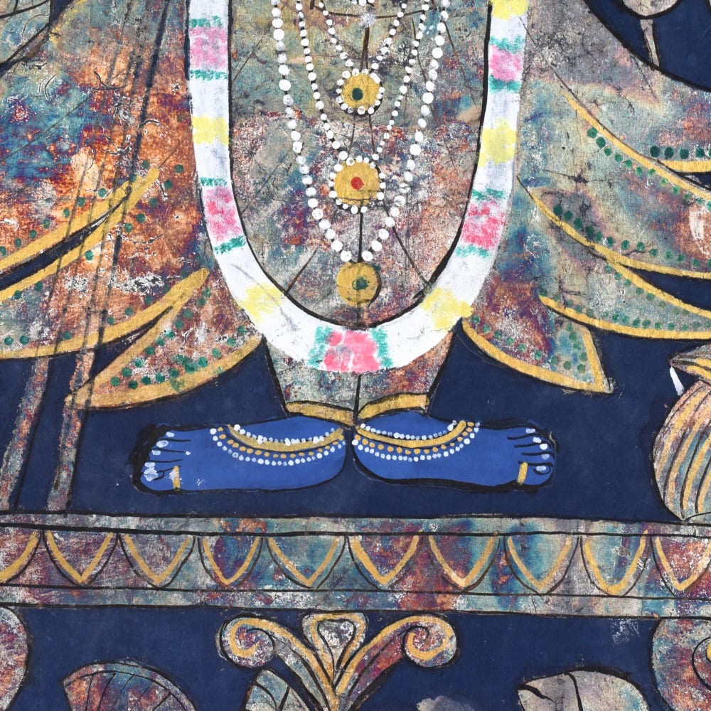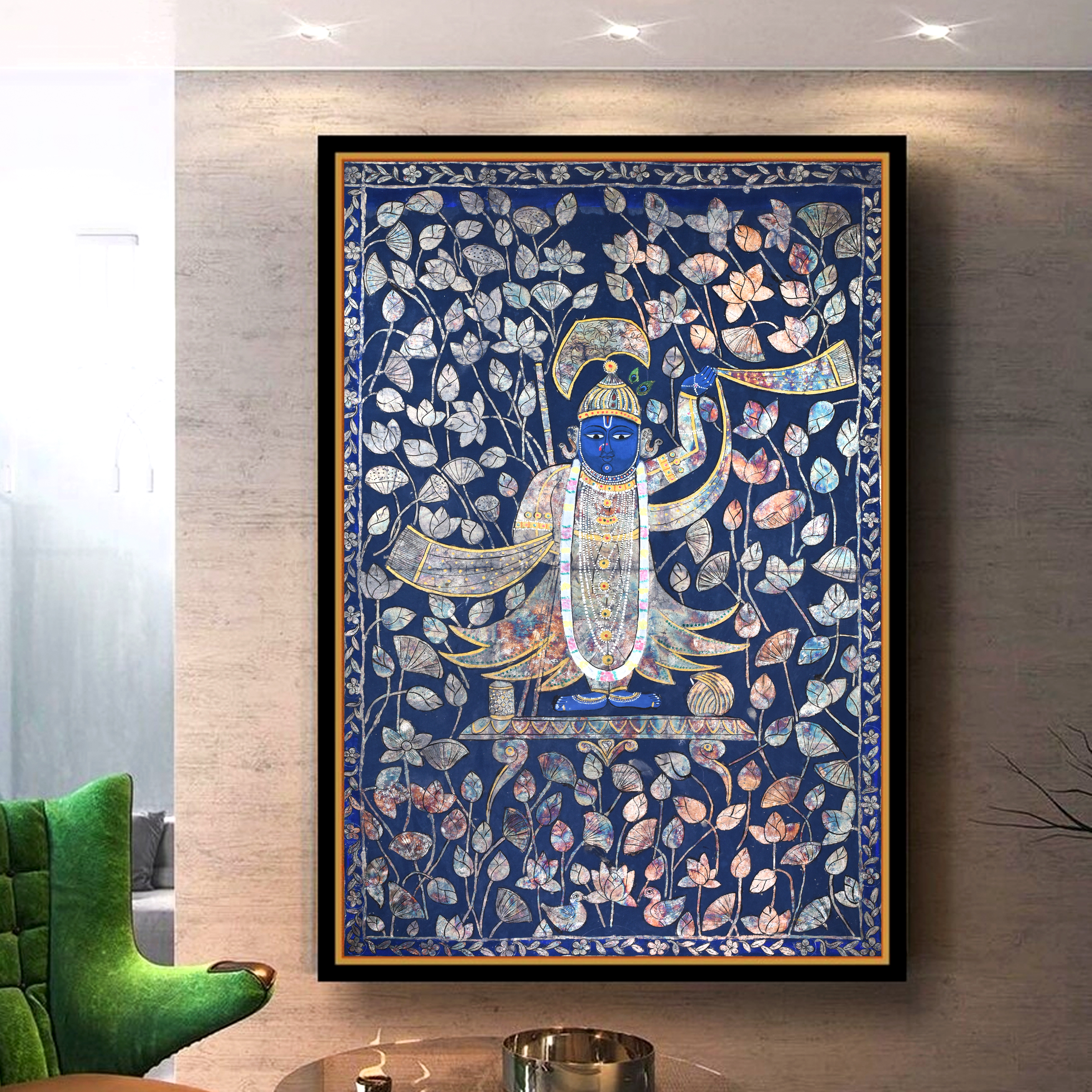 Immerse yourself in the divine essence of Lord Krishna with this exquisite cloth pichwai painting without frame, a masterpiece that will captivate your senses and transport you to a realm of spiritual serenity. This cloth pichwai painting is not merely a work of art - it's a portal to the sacred world of Hindu mythology. The ethereal blue backdrop sets the stage for the divine presence of Lord Krishna, whose captivating form is surrounded by a symphony of delicate floral motifs. Whether you're adorning your home, office, or place of worship, this pichwai painting will elevate your spiritual sanctuary, inviting you to bask in the grace and wisdom of the beloved Lord. Its timeless elegance and profound significance make it a cherished addition to any collection, a testament to the rich cultural heritage of India. Elevate your home decor and nourish your soul with the mesmerizing cloth pichwai painting of Lord Krishna - a true masterpiece that will inspire and uplift you every day.
