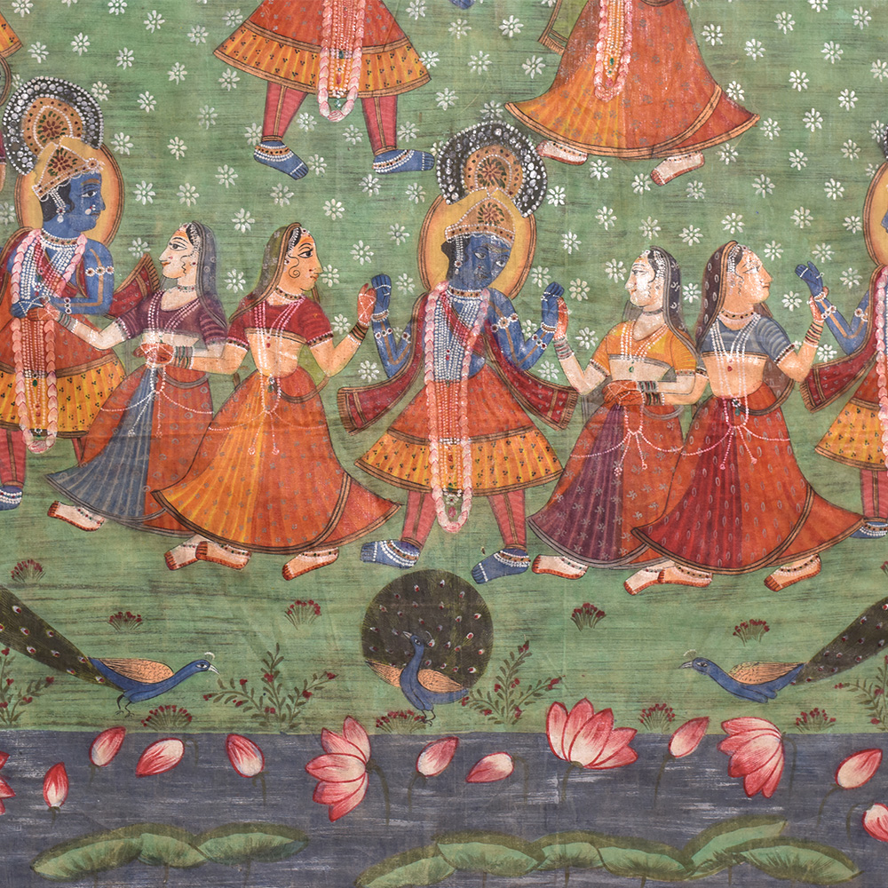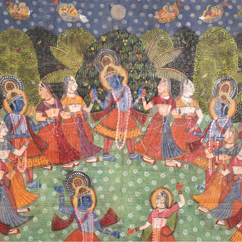 Pichwai painting is a traditional Indian art genre known for representing episodes from the life of Lord Krishna, a renowned Hindu deity. The Rasleela, a cosmic dance performed by Lord Krishna with the gopis or cowherd females of Vrindavan, is one of the most memorable episodes of his life. Krishna Rasleela's Pichwai painting captures the spirit of this magnificent dance and is a lovely portrayal of India's rich cultural history. Lord Krishna is shown as a youthful and playful god, surrounded by gopis in various stances, dancing and singing in joy. The painting's composition revolves around Lord Krishna, represented in his trademark blue skin, playing his flute and surrounded by gopis. The gopis are seen in bright saris dancing around Lord Krishna, engrossed at the moment. The artwork's backdrop is loaded with detailed features, such as trees, flowers, and animals, which give the image depth and substance. The painting's bold and brilliant colours, red, yellow, and green, dominate the composition. The artwork reflects Rasleela's exuberant energy, with Lord Krishna and the gopis caught up in the holy bliss of the dance. Krishna Rasleela's Pichwai painting is a timeless piece of art that reflects the beauty of Indian culture and its rich creative legacy. It is a monument to the painters' ability and ingenuity and a reminder of Hindu mythology's deep spiritual foundations.