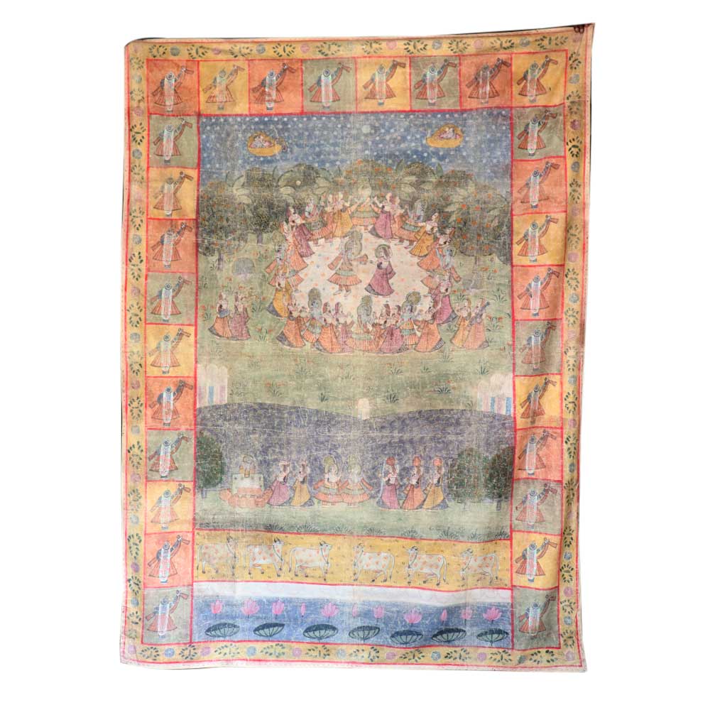 A detailed Pichwai Painting of Lord Krishna dancing with the gopis on sharad poornima. This dance form is also referred to a Ras Leela. There are different forms of SreenathJi drawn on the border of the painting. These paintings are hand painted by local craftsmen and artisans of nathwara using natural colors. This can be used as festival decoration, stage decoration, wall hanging for Hotel, spas, club wall decor as well as a Diwali gift, New year gift, housewarming gift and souvenir for your near and dear ones.