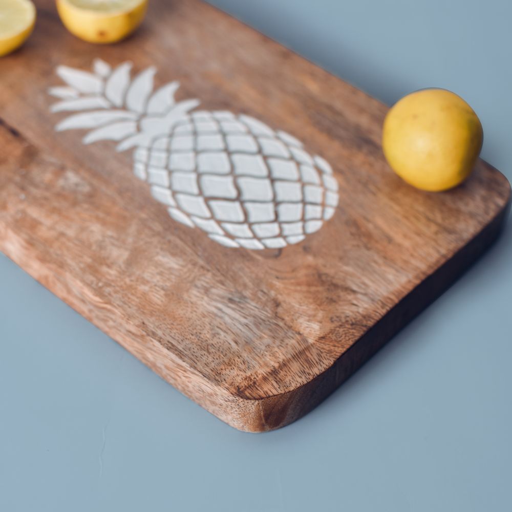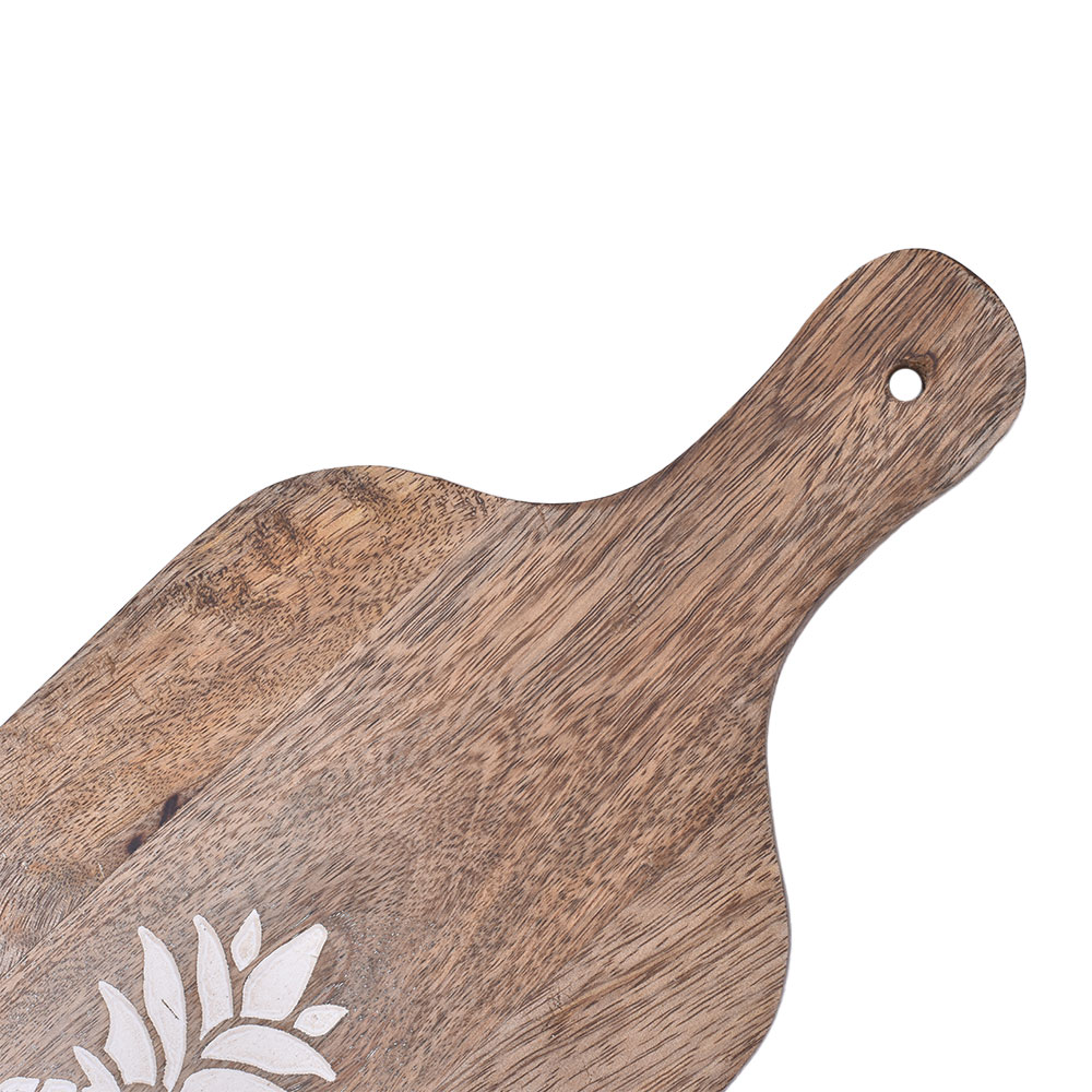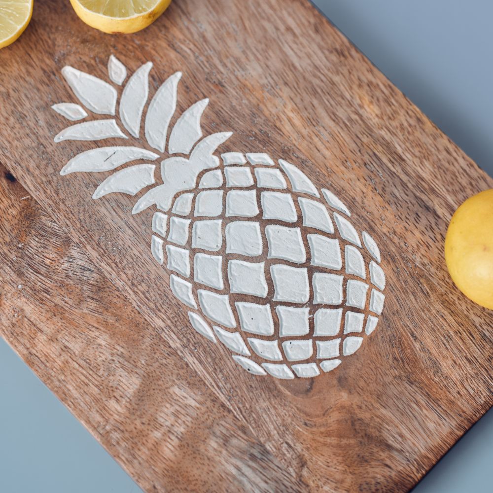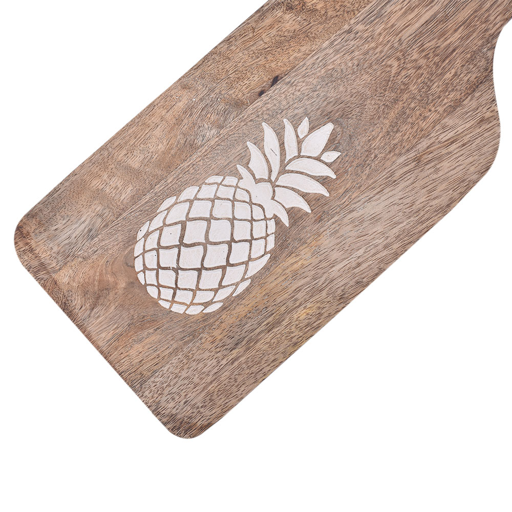 A wooden cutting board with a handle is a useful kitchen utensil that is also aesthetically beautiful. These boards are often produced from premium woods like maple or bamboo and are strong and long-lasting, making them an excellent investment for any home cook or chef. A hardwood cutting board or serving tray with a handle has several advantages, one of which is that it is soft on blades, keeping them sharp and in good condition. It is simpler and safer to prepare food because of the wood's natural texture, which also makes cutting and chopping jobs easier to do. It includes a comfortable grip handle and a pineapple drawing that makes it more distinctive.