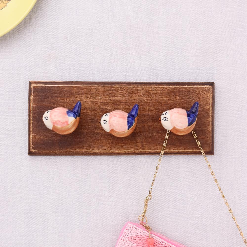 Pink Blue Ceramic Bird Modern Kids Wooden Wall Hook. It can be use to Hang Jewellery, Leashes, Towels, Scarves, Light Weight Sweaters, Caps Etc.