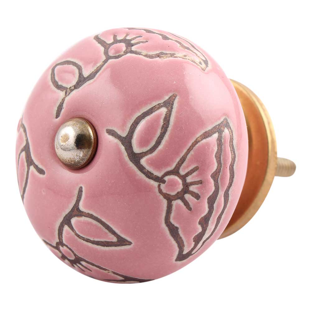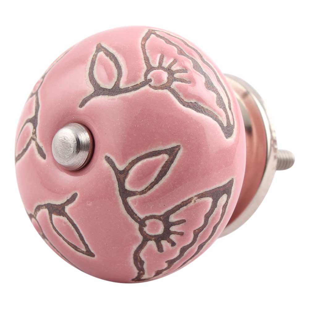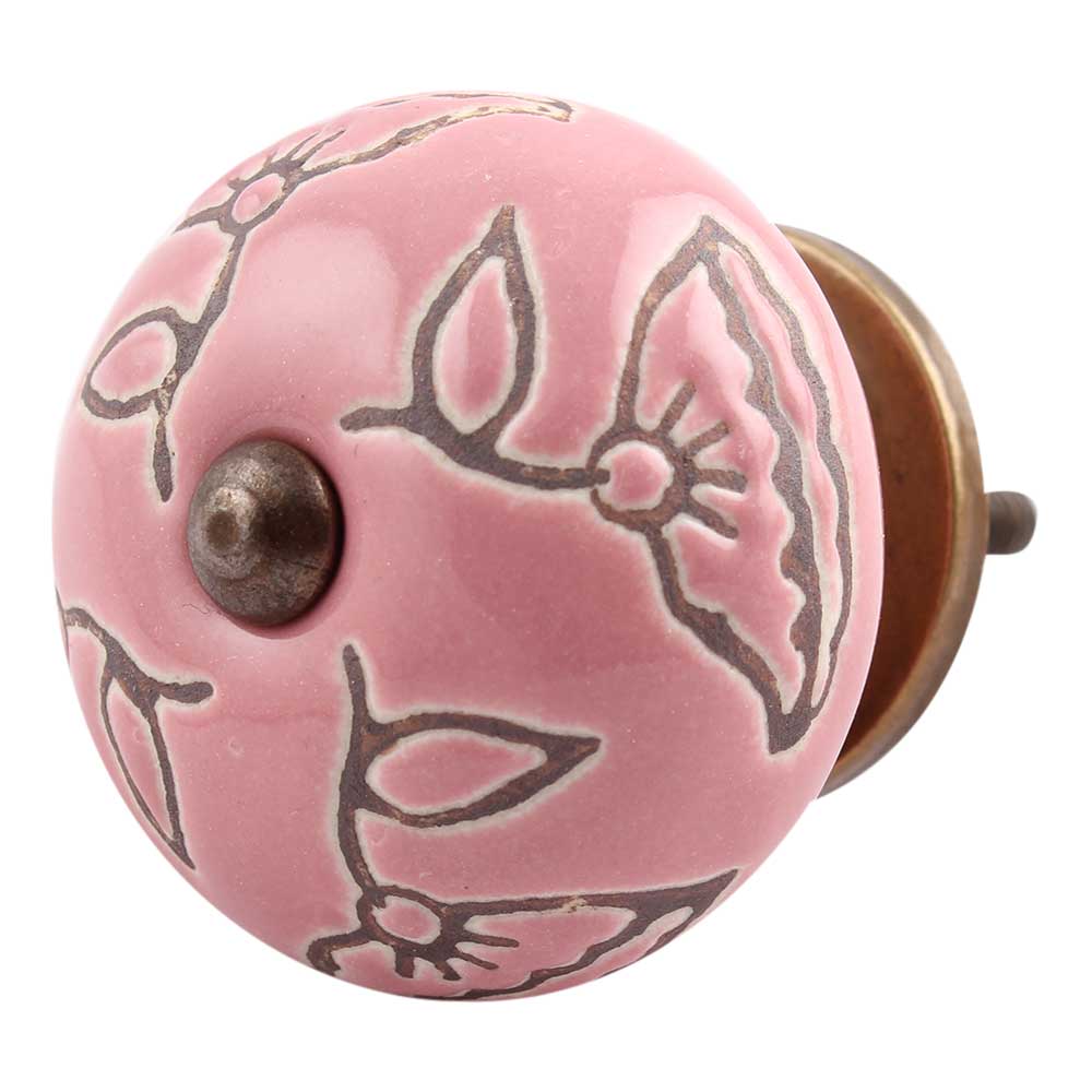 Pink Calla Lily Brown Etched Ceramic Cabinet Knob