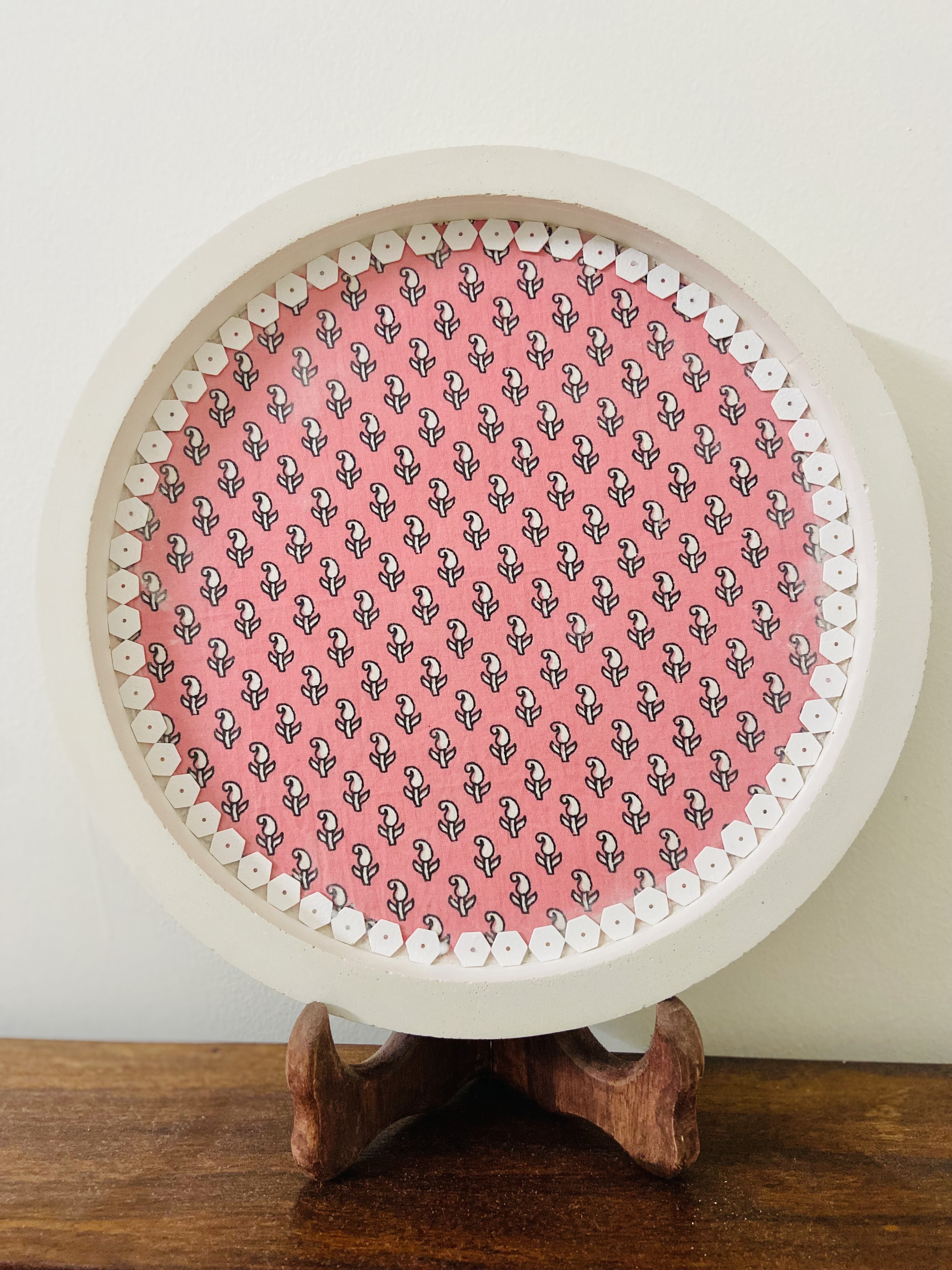 Brighten up your living space with this charming Pink Cemented Plate for Home Decor, adorned with a delicate floral block-print pattern. The vibrant pink base and geometric border detailing make it a perfect statement piece for modern as well as traditional interiors. Ideal for display on walls, shelves, or as a thoughtful artisan-made gift.