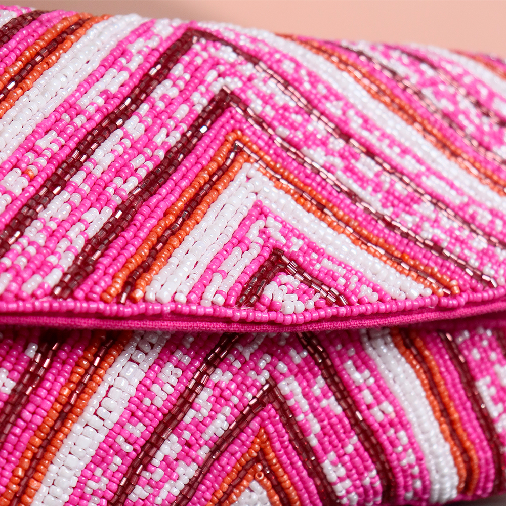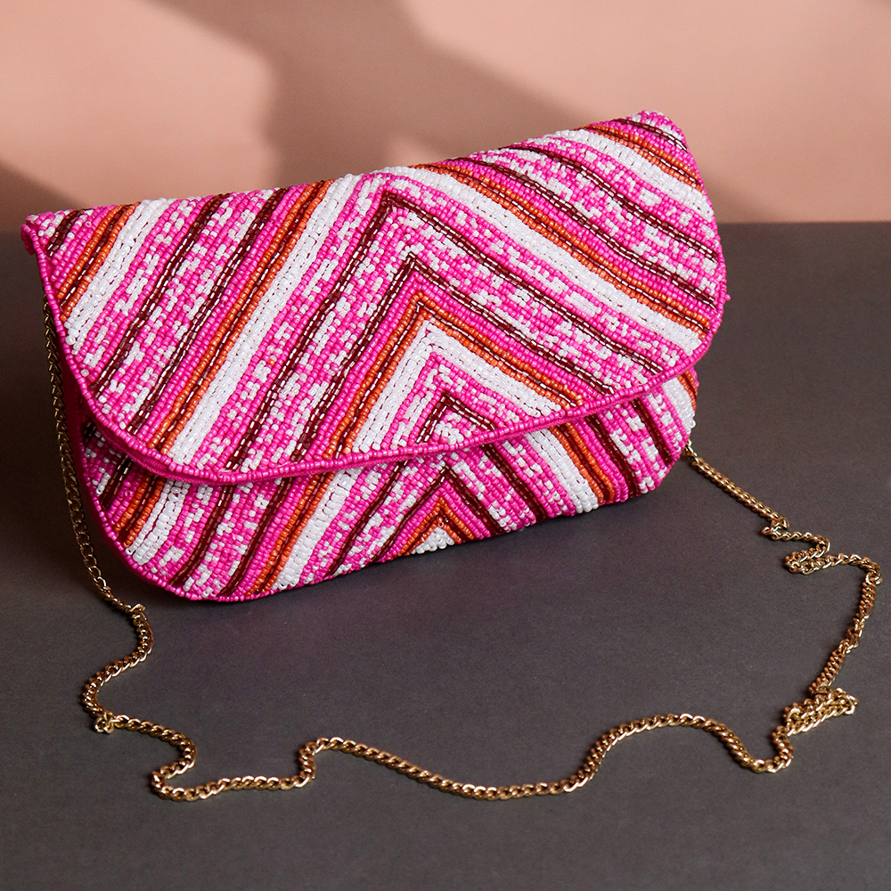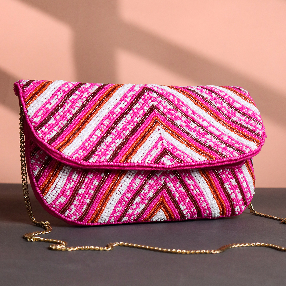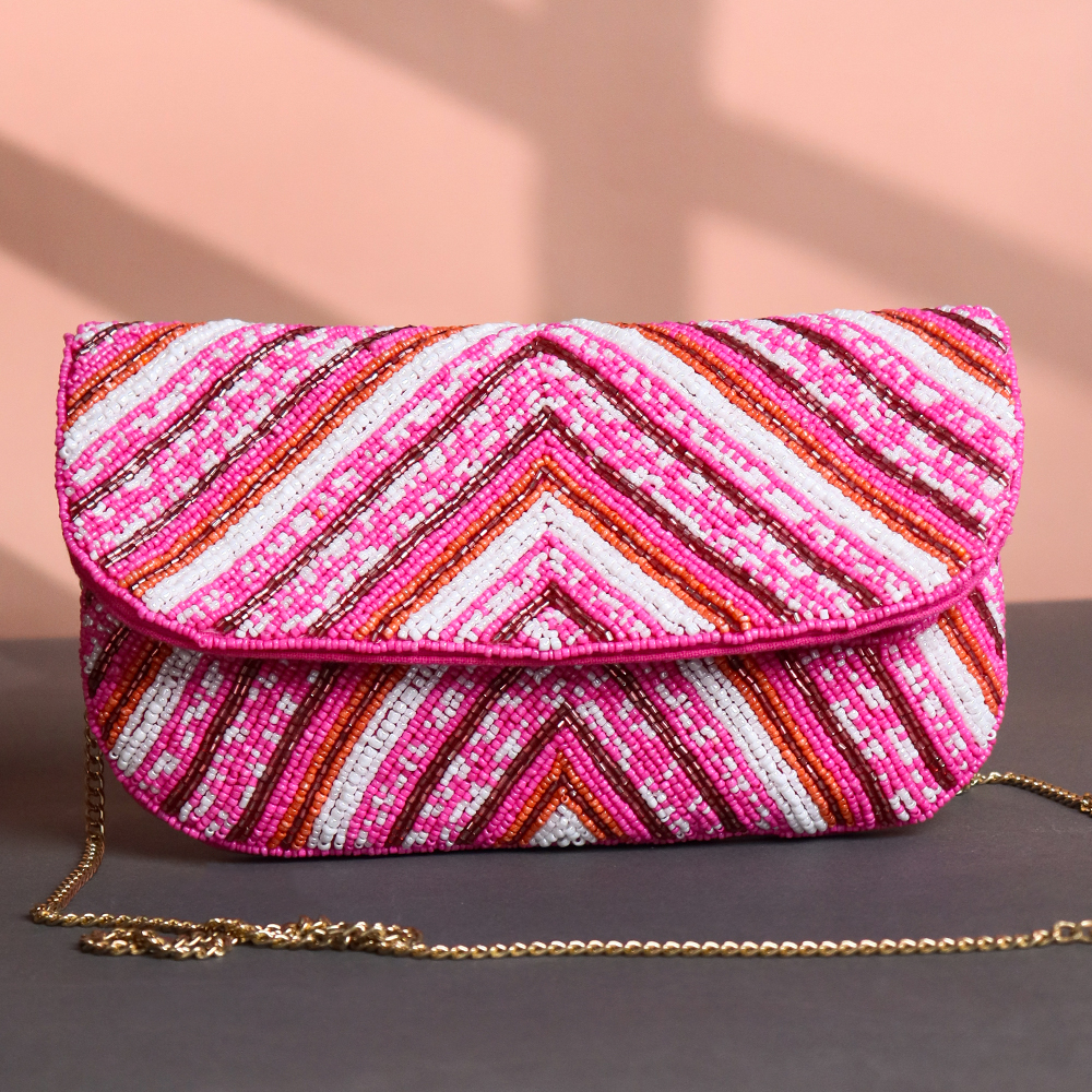 Turn heads with this vibrant Pink Chevron Hand-Beaded Clutch — a bold fashion statement made for festive evenings and glamorous get-togethers. Featuring a striking chevron pattern in hot pink, red, orange, and white beads, this structured clutch adds playful texture and sparkle to any outfit. The sleek gold chain strap completes the look with a touch of sophistication.Perfectly sized to hold your essentials, this handcrafted beauty is ideal for weddings, cocktail parties, or any occasion where style is a must. A must-have piece for those who love bold accessories with an artisanal touch.