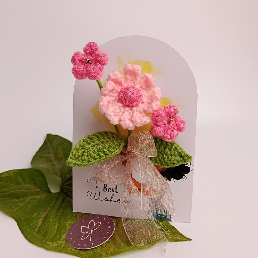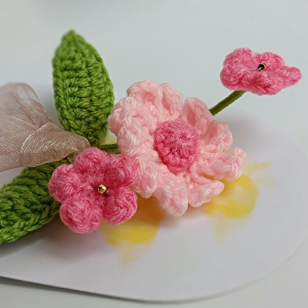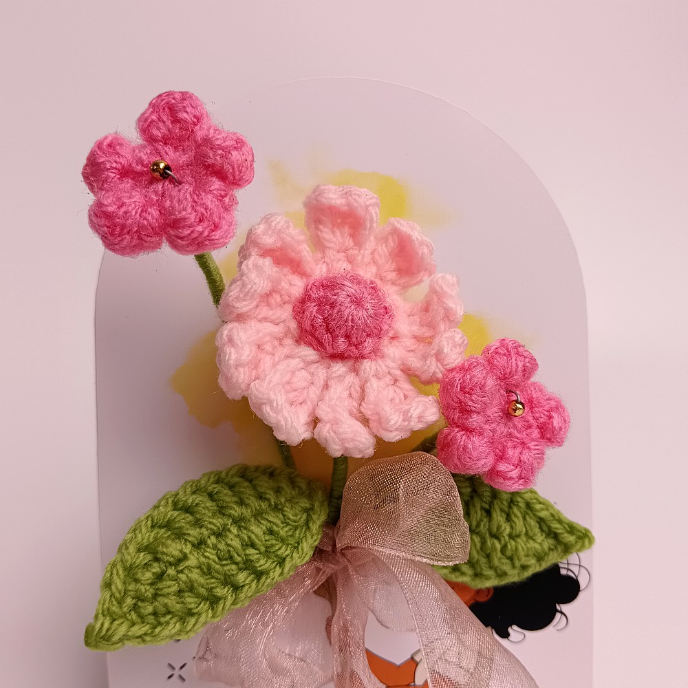 Keep your pink crochet piece away from moisture and direct sun to prevent dust and fading. Dust gently with a soft brush or a hairdryer on cool, and reshape stems carefully if needed.