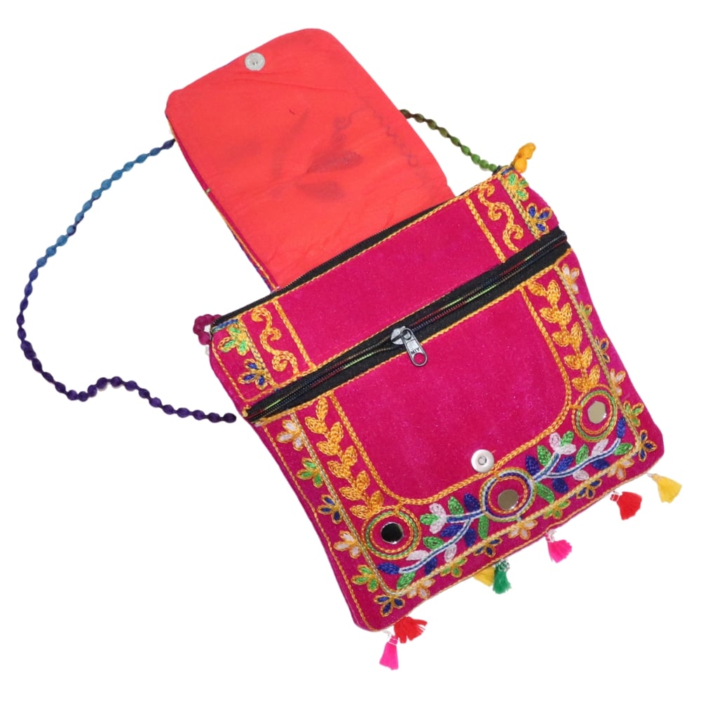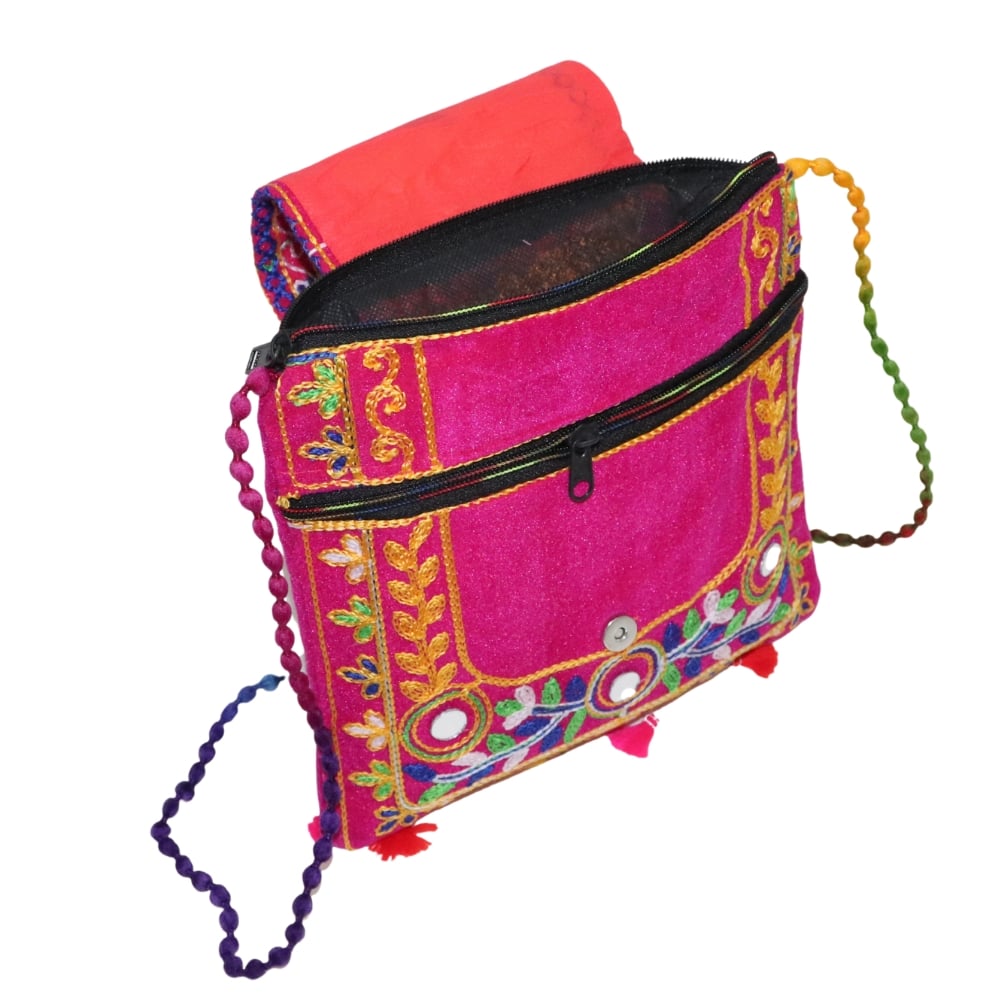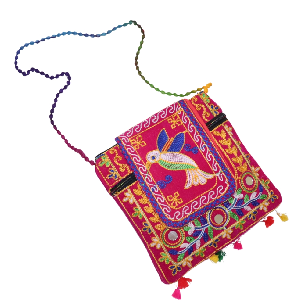 Add a splash of vibrant tradition to your look with this stunning Jaipuri Handmade Embroidered Sling Bag. Crafted from high-quality cotton fabric, this eye-catching pink bag features a beautifully embroidered bird motif, intricate floral designs, and traditional mirror work that celebrates the essence of Rajasthani artistry. The colorful braided strap and playful tassels enhance its bohemian charm, making it a perfect accessory for casual outings, festivals, or travel. Lightweight and compact, this crossbody bag offers just the right amount of space for your daily essentials while adding a bold pop of color to any outfit. The secure flap closure ensures your belongings stay safe, and the unique design makes it a great gift for lovers of handcrafted, eco-conscious fashion. Embrace tradition with a modern twist—carry this Jaipuri embroidered sling bag and let your style speak of culture, creativity, and craftsmanship. Perfect for ethnic wear, Indo-western looks, or everyday flair.