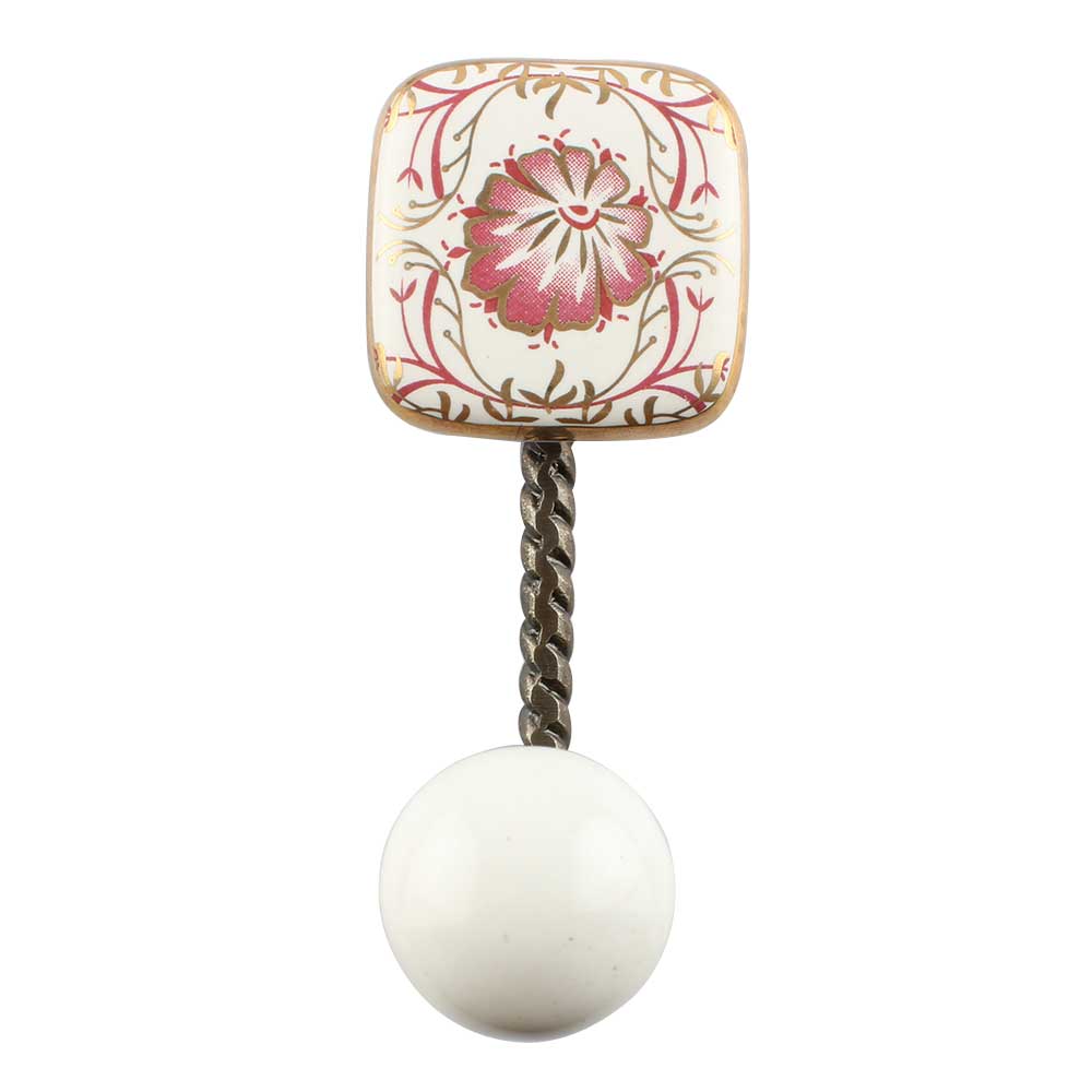 Material: Glazed ceramic tile with metal alloy antique brass base Finish: Glossy ceramic in pink floral motif, antique finish metal hook Installation: Concealed screw-mount system for a seamless, hardware-free look