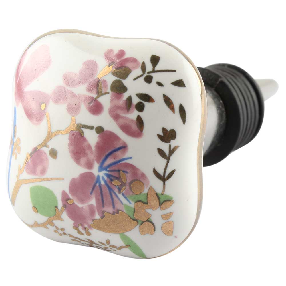 Pink Flower Square Ceramic Wine Stopper. Zinc Alloy Wine Bottle Stopper with Attractive Jute Bag Packaging.