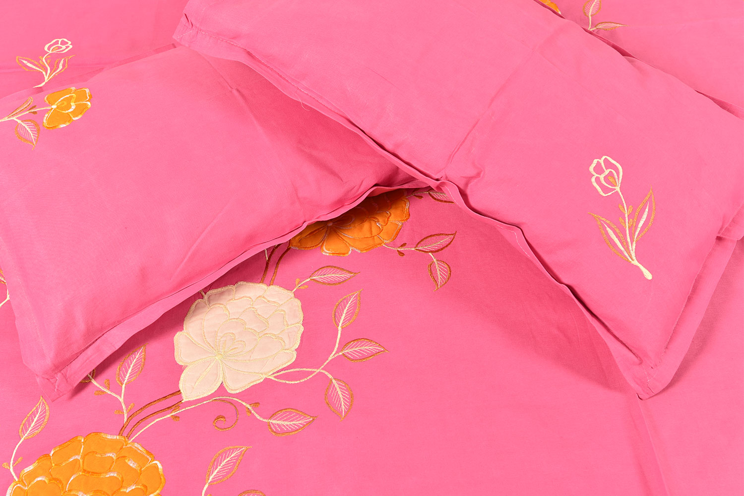 Pink Bed Linen with Yellow & White Floral Design . Hand crafted supporting eye capturing designs and colours.