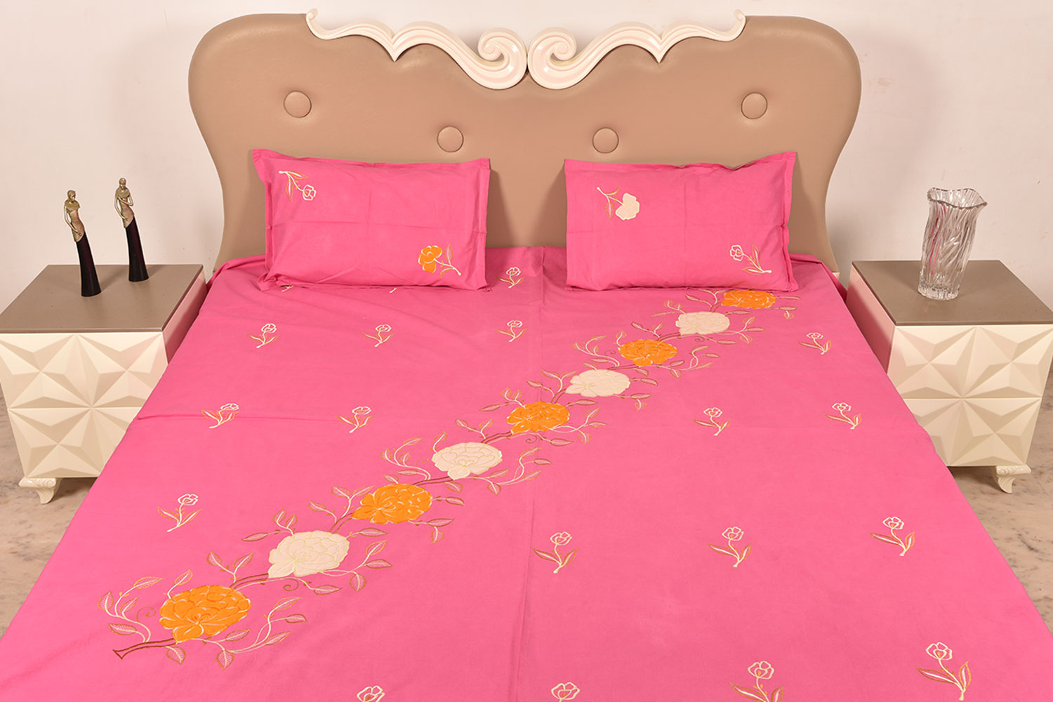 • Pink Handmade Bed Sheet Linen with Yellow & White Floral Design Beautiful Decorative Stylish