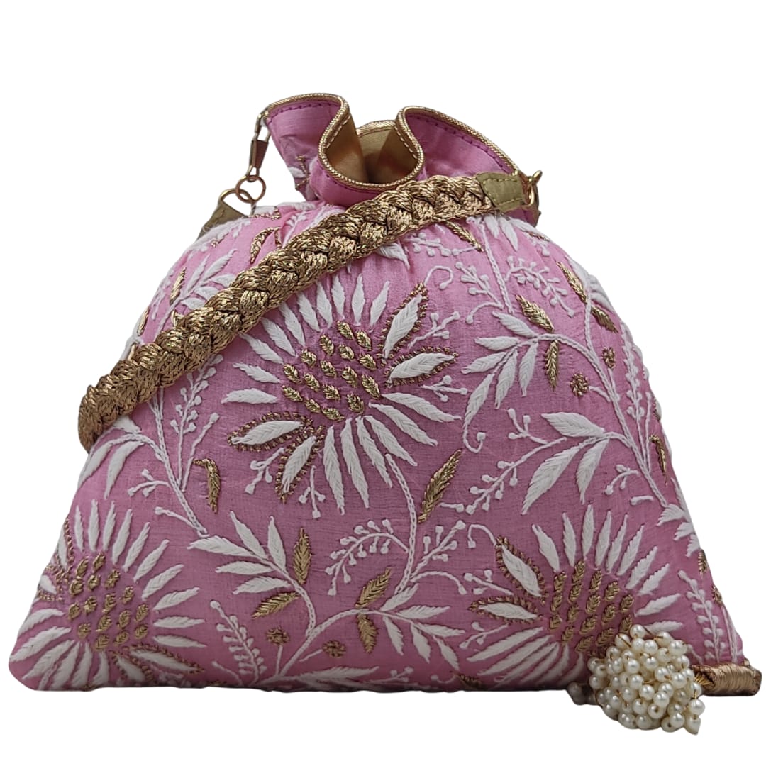 Brighten up your festive look with this charming handcrafted potli bag in a refreshing pastel pink hue, made from luxurious tussar silk. Showcasing the timeless artistry of Chikankari embroidery on both sides, the bag features striking floral motifs in white thread, enhanced with elegant gold kasab highlights for a rich, detailed finish. The bag includes a braided golden handle and a traditional drawstring closure, both functional and decorative. The drawstring ends are adorned with clustered pearl tassels, adding a delicate finishing touch. Ideal for weddings, parties, or festive occasions, this pink potli complements sarees, lehengas, and Indo-western outfits alike. While compact in size, it is perfectly sized to carry your essentials in style. Whether you're dressing up for a celebration or gifting it to someone special, this potli bag strikes the perfect balance of tradition, elegance, and contemporary flair.