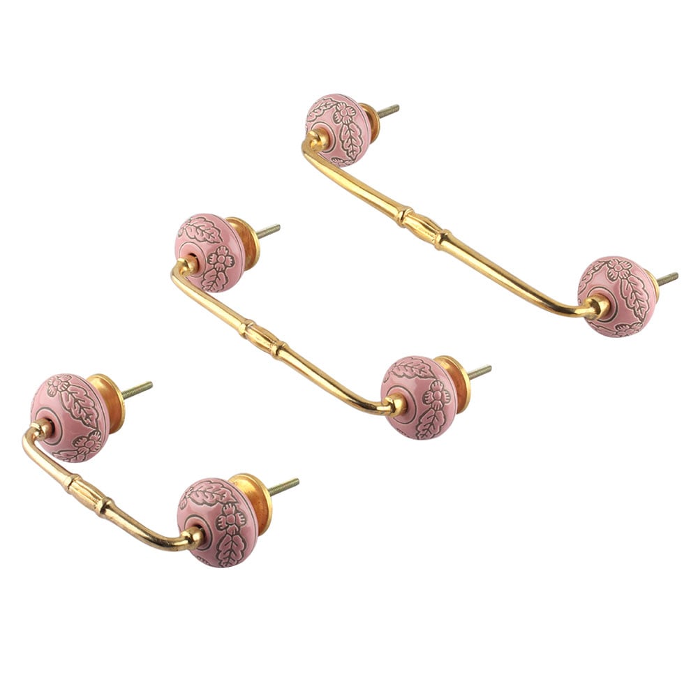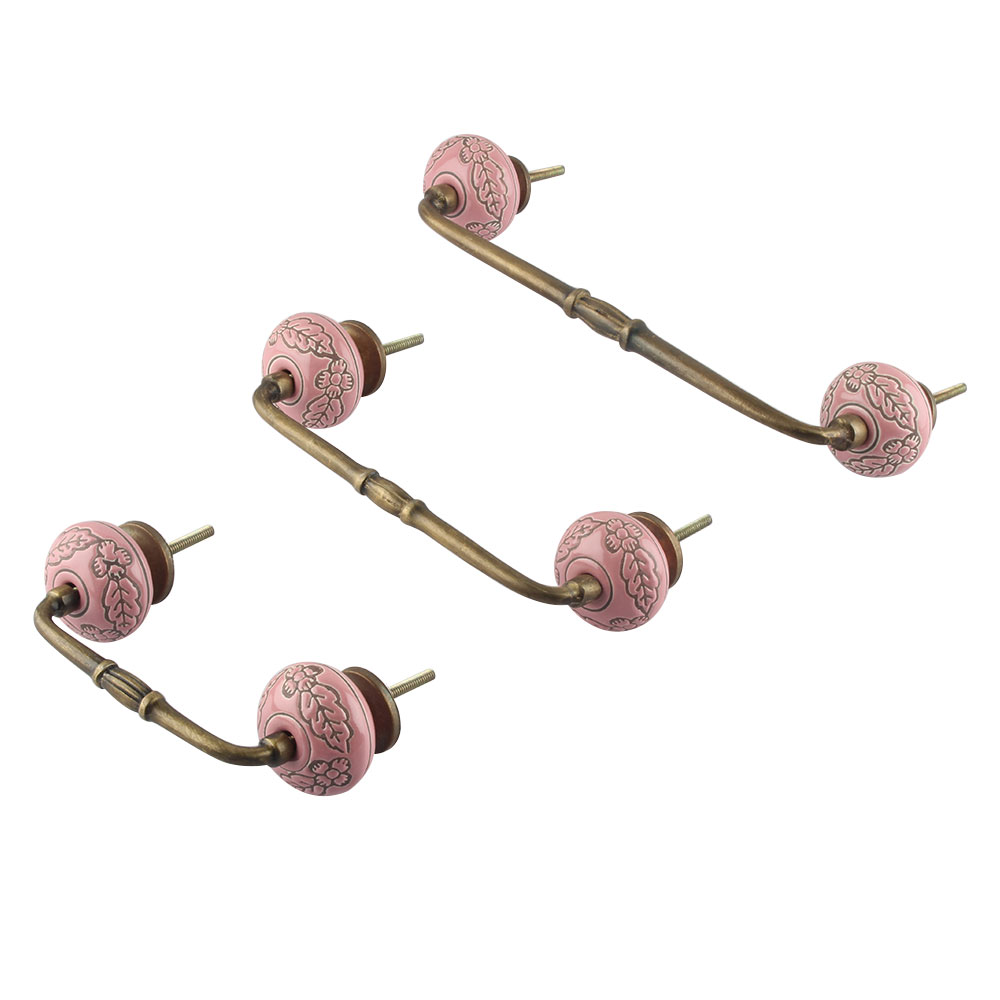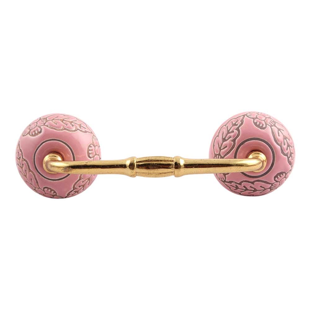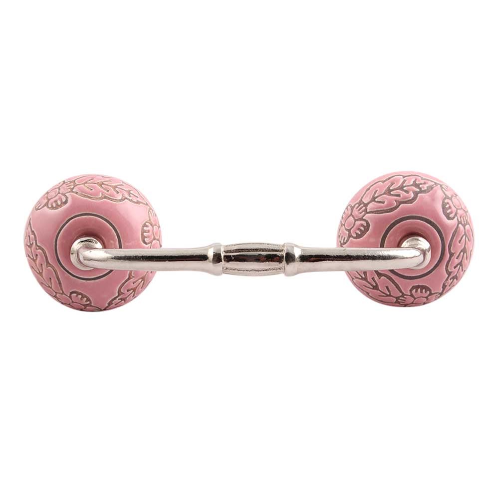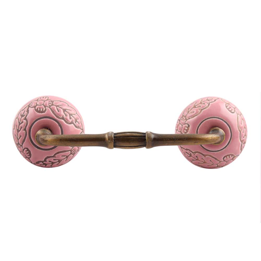 Pink Leaf Flower Etched Ceramic Bridge Handle. Ideal for Drawer, Dresser, Cabinet, Wardrobe, Cupboard and Almirah.