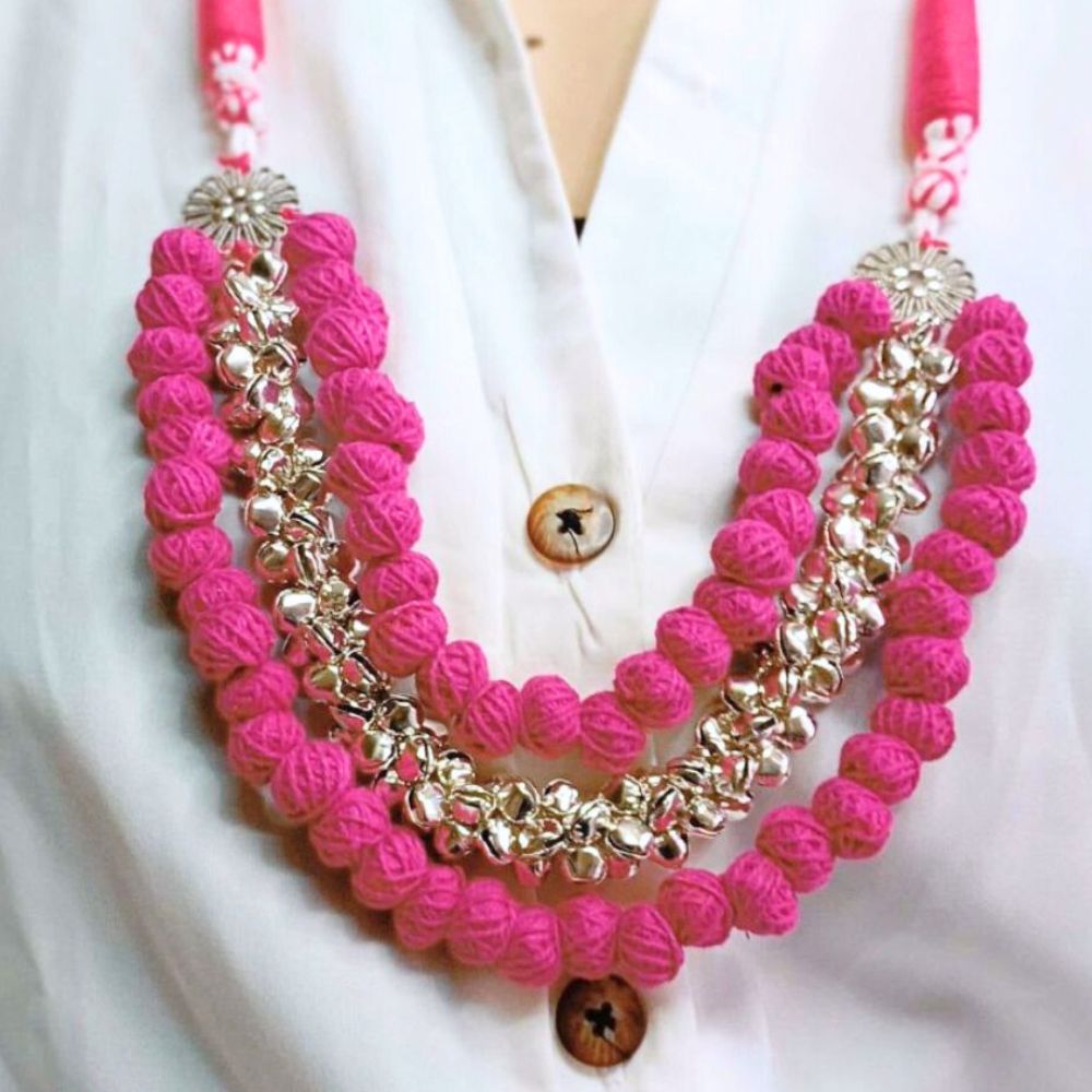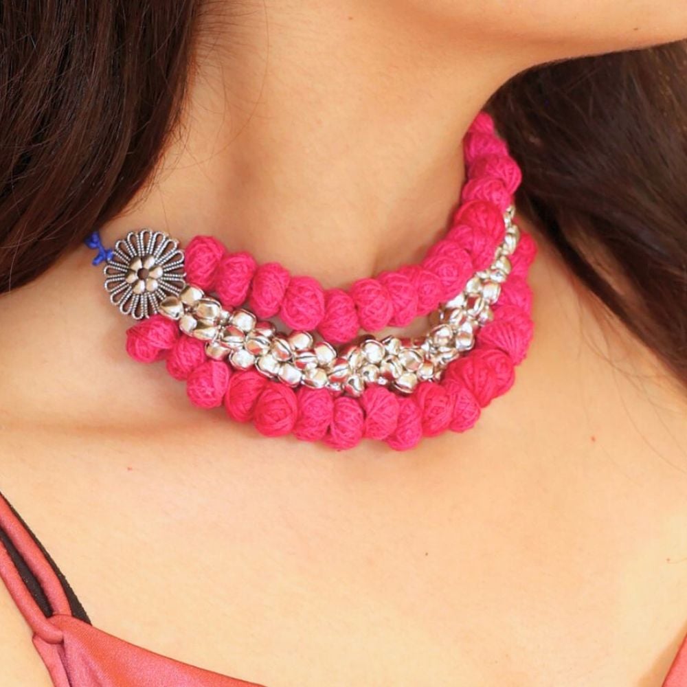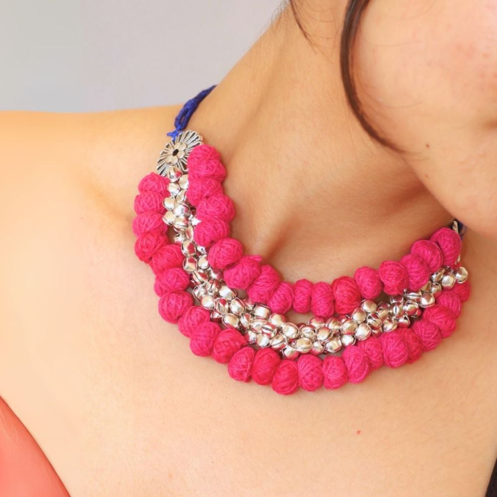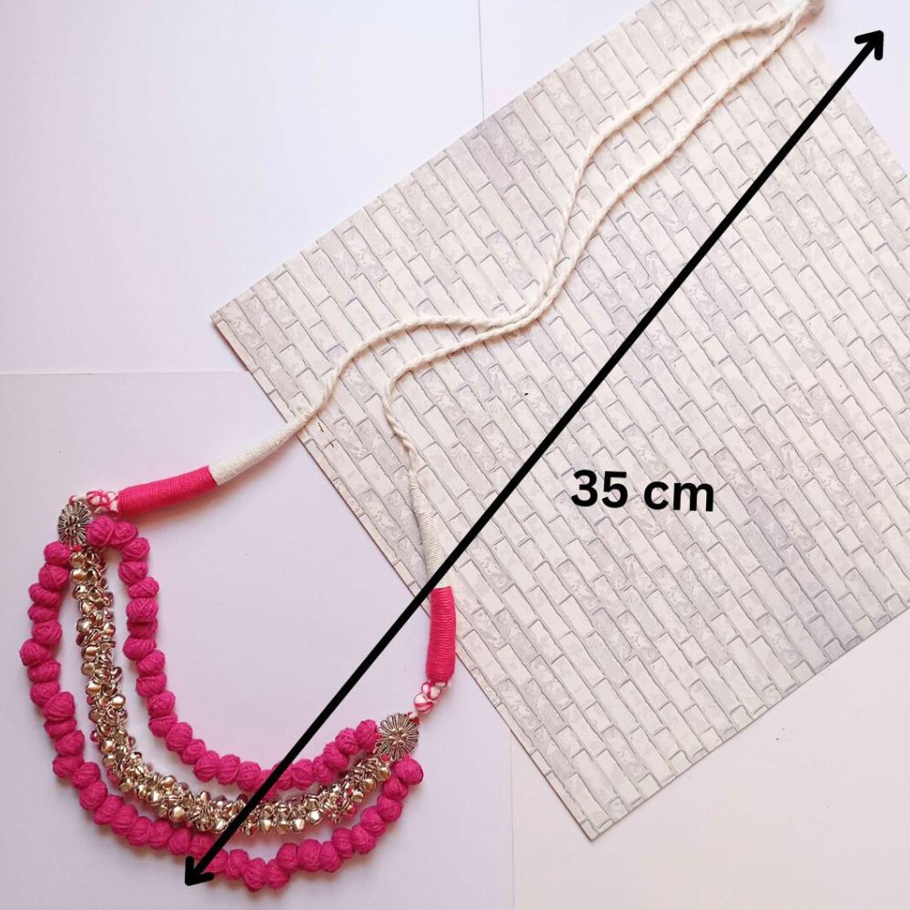 The Pink Pom Pom Ghungroo Choker Plus Long Necklace is a joyful blend of movement, color, and traditional detailing. Crafted on a fabric base, soft pink pom poms create a playful, tactile rhythm, while silver-toned ghungroo accents add gentle shimmer and sound. Designed to be worn as a close choker or styled as a longer necklace, this versatile piece adapts effortlessly to festive and fusion looks. It reflects artisan-inspired creativity rooted in Indian celebratory jewellery traditions.