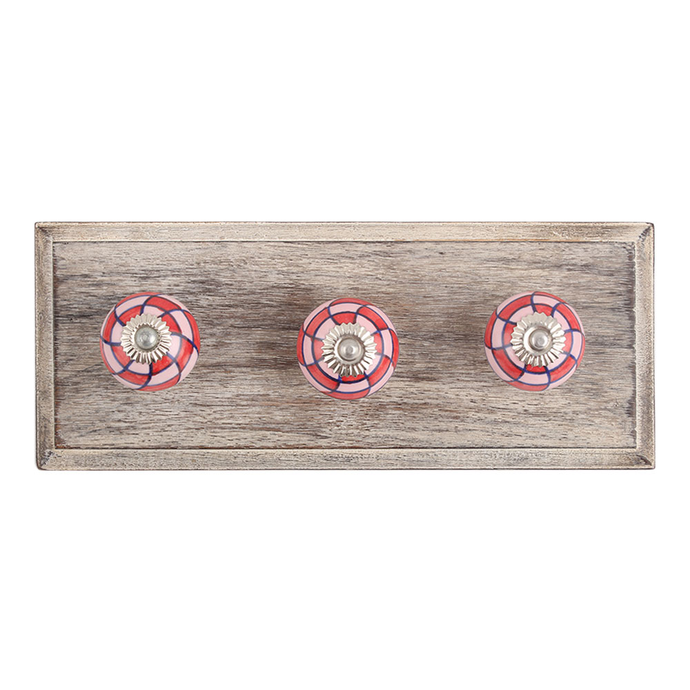 Pink Red Check Ceramic Wooden Hook. A Perfect Complement to the Soft Tone of the Wood are these White Traditional Hat Coat Hook Made of Genuine Porcelain and Brass. It can be use to Hang Jewellery, Leashes, Towels, Scarves, Light Weight Sweaters, Caps Etc.