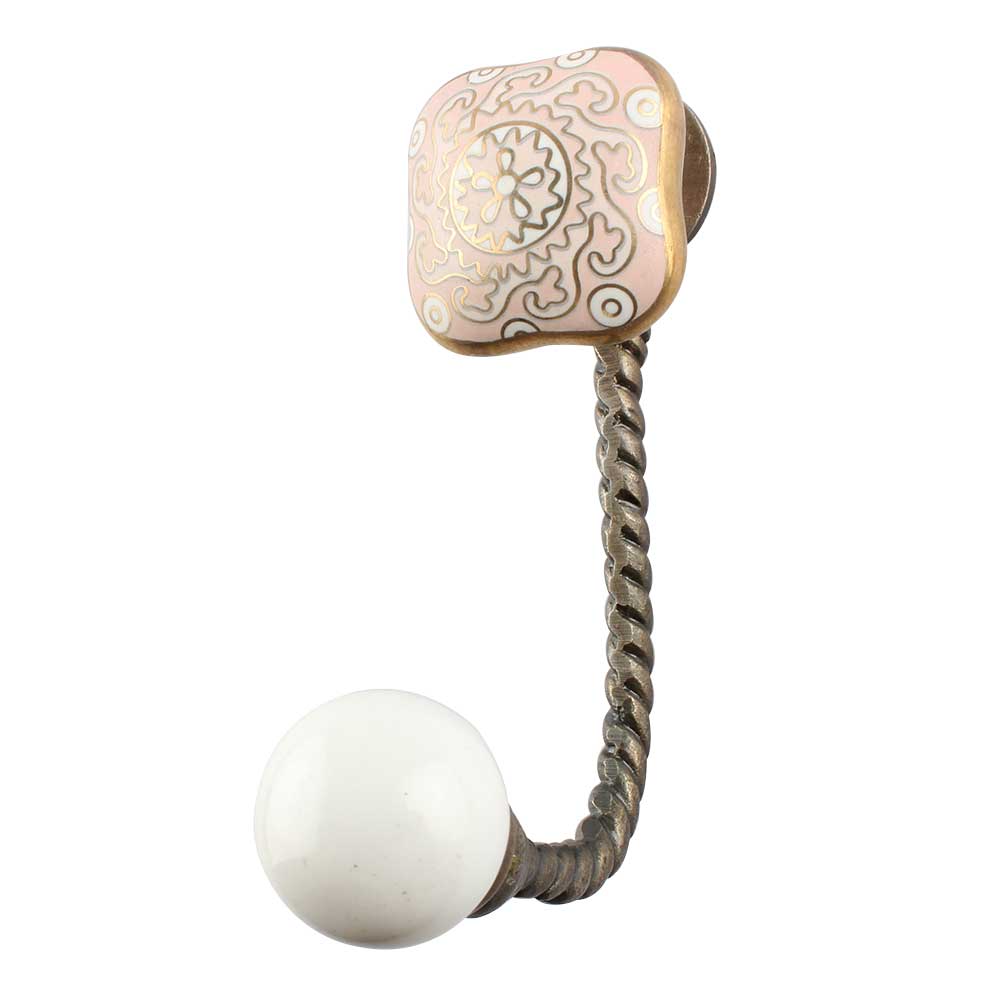 Material: Glazed ceramic tile with antique brass-finish metal hook Finish: Glossy blush pink ceramic, matte antique metal fitting Installation: Concealed screw-mount system for a clean, streamlined appearance