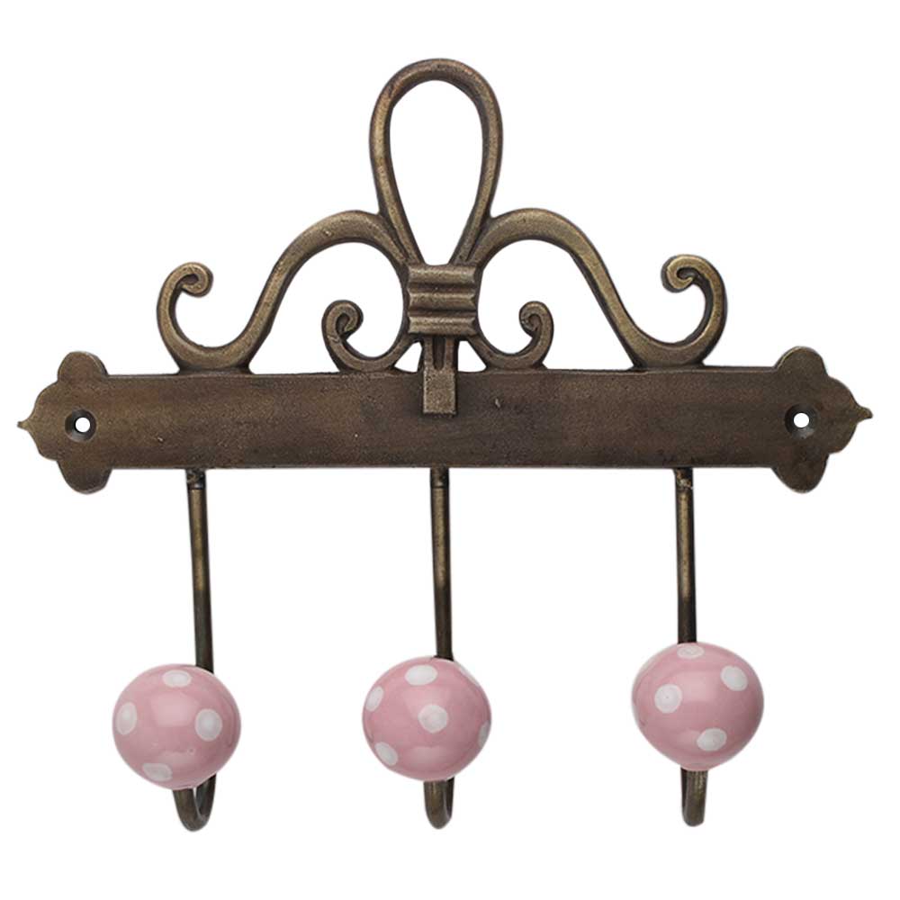 Pink White Dot Ceramic Iron Hook. A Perfect Complement to the Soft Tone of the Wood are these White Traditional Hat Coat Hook Made of Genuine Porcelain and Brass. It can be use to Hang Jewellery, Leashes, Towels, Scarves, Light Weight Sweaters, Caps Etc.