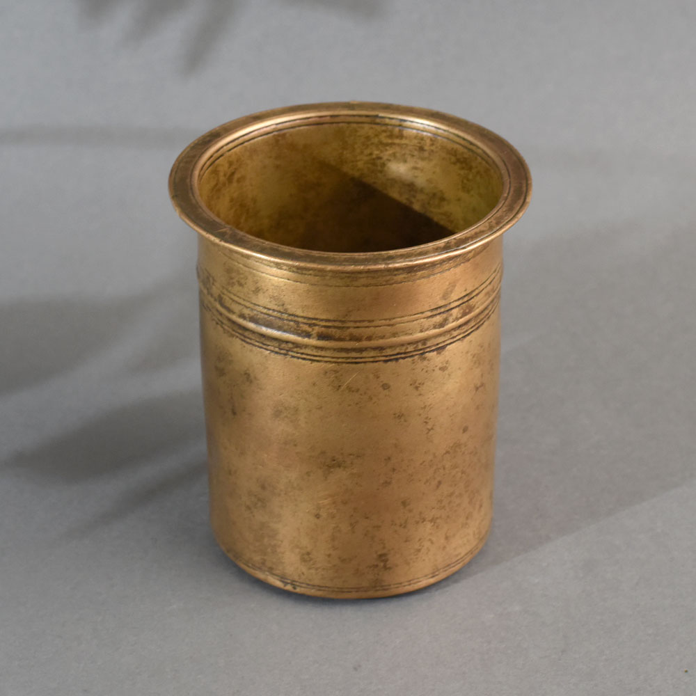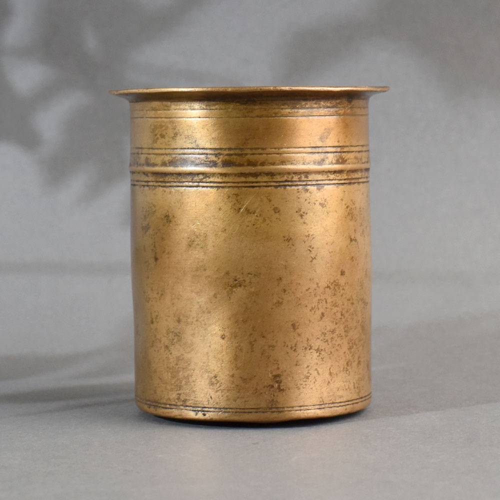 This antique brass Panchpatra holy water pot is a classic ritual vessel traditionally used in Hindu religious ceremonies. Crafted from solid brass, it features a cylindrical body with a wide flared rim and simple triple-line engravings around the upper and lower sections. The minimalist design highlights its functional elegance while preserving the essence of sacred Indian craftsmanship. Used to hold Gangajal (holy water), this Panchpatra is an essential part of daily puja rituals and is often accompanied by an uddharani (spoon) for sprinkling or offering the water. Brass, a spiritually significant metal in Indian culture, is believed to purify and energize, making it ideal for sacred use. The natural patina gives the pot a vintage charm and marks its authenticity and heritage.