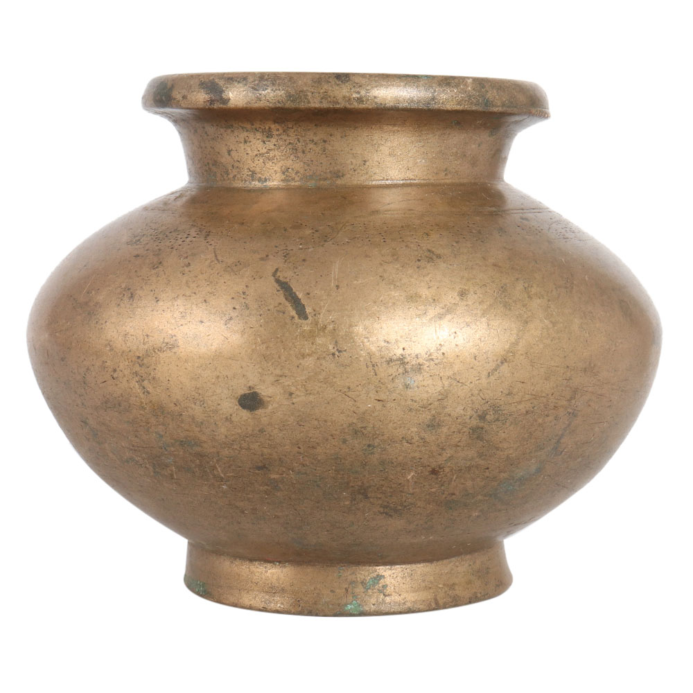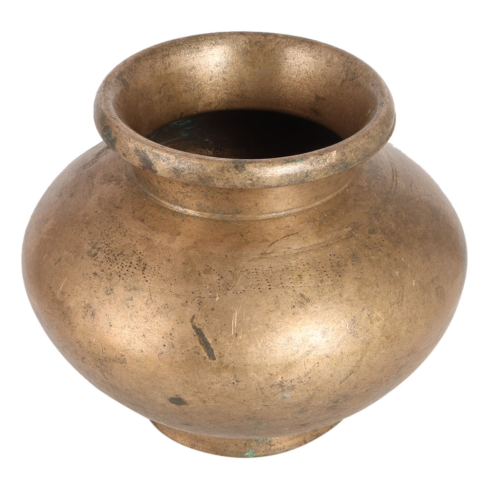 This plain spiritual Kalash or water pot is carved from a brass metal alloy. It has a vintage style look with its brownish colour. It has as smooth surface with a large belly. It is used in the Kalash Yatra. A Purna Kalash is a pot with a small mouth and a large belly filled with water, rice or gold coins, and mango leaves placed on it so that they touch the water, with a coconut on top. When a statue of the god is established in the temple, a Kalash yatra is held. Beautify your home with this simple, attractive Kalash.