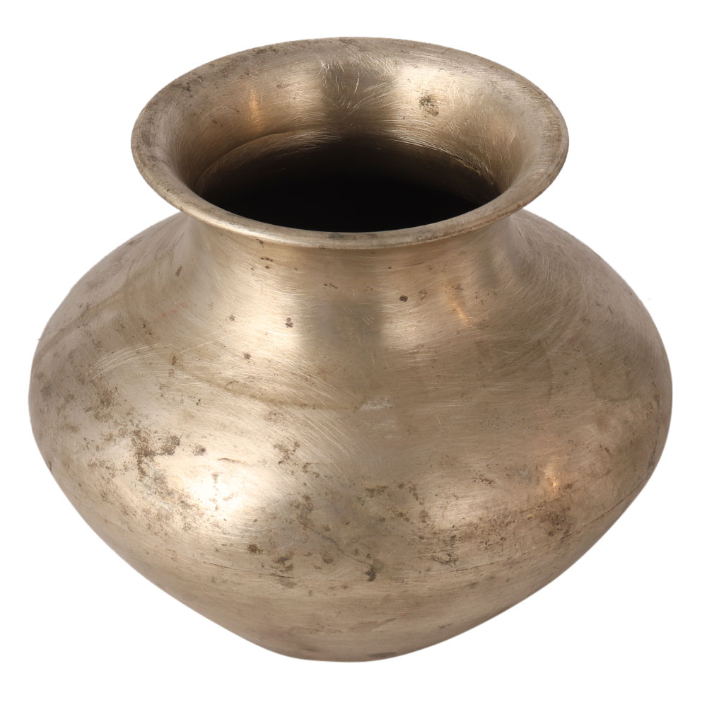 A traditional Gangajal lota or water pot made of a white metal alloy. It has a plain design with a flat surface. It was handmade by skilled workers of Himachal Pradesh, India. It has been used for Pitra Pooja (a prayer in memory of paternal ancestors) since ancient times. Beautify your home or office with this water pot.