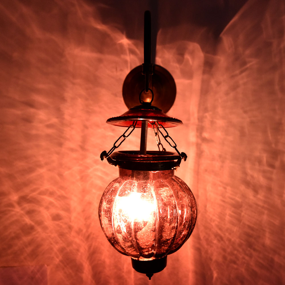 Plum melon shaped glass hanging lamp on bronze bracket. The lamp is unique and allows a great lighting option for any room.