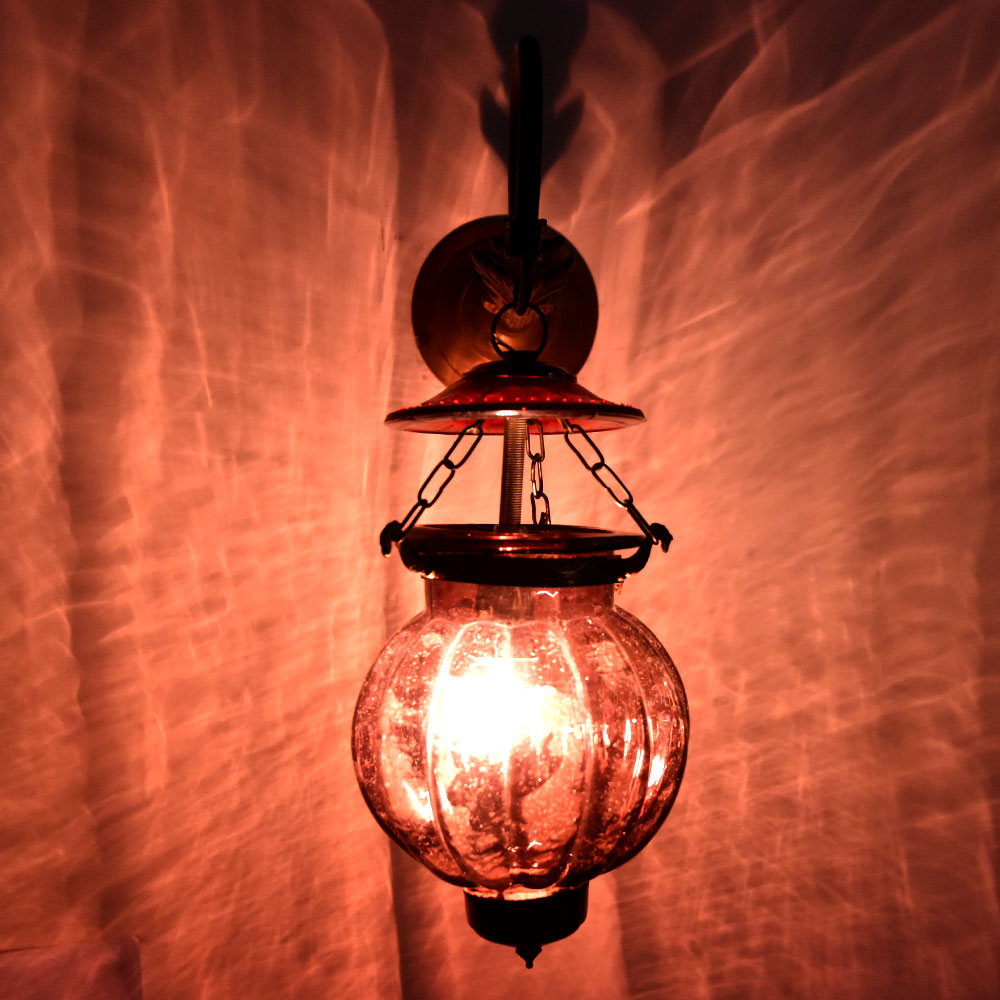 Plum melon shaped glass hanging lamp in leafy bronze bracket. The lamp is unique and allows a great lighting option for any room.